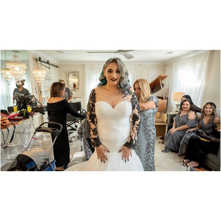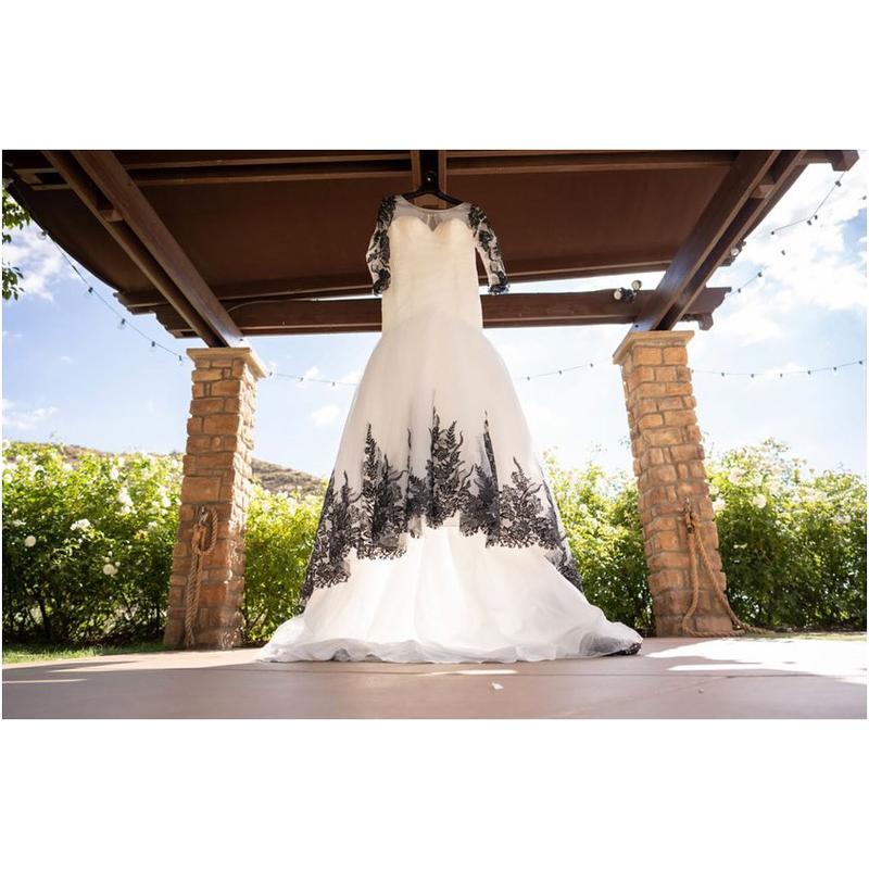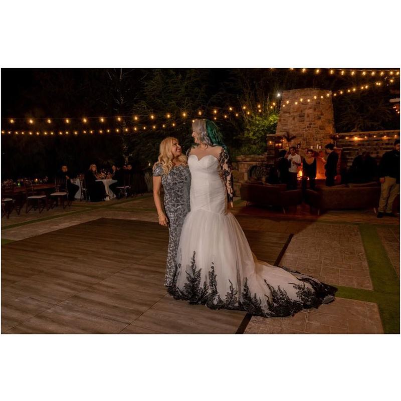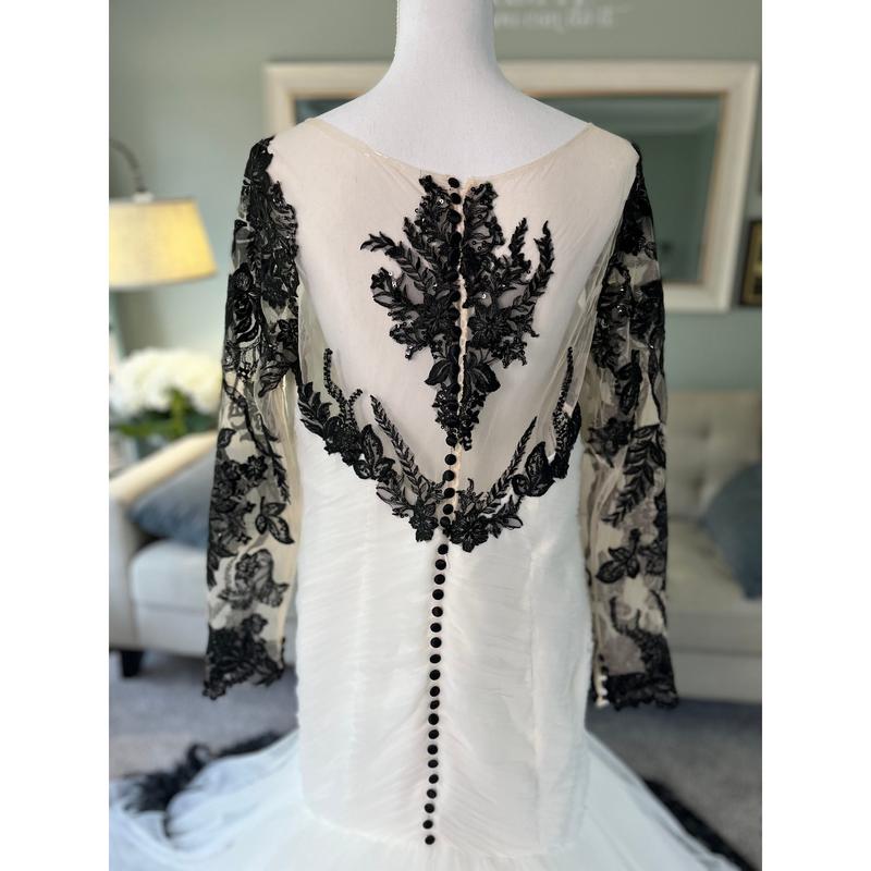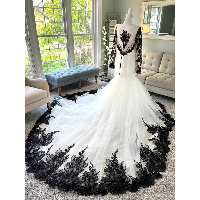 Our Raisa custom black and white mermaid wedding dress has been created for our bride, Raisa . It features gorgeous black lace with ivory satin/tulle , and it has a gorgeous illusion back with black buttons . The perfect choice for a halloween wedding!