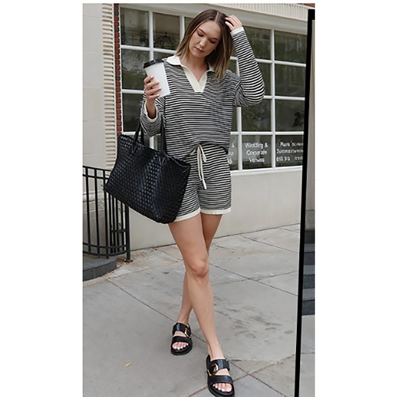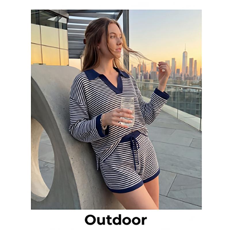 ·Features: This women's two piece set features long sleeve, v neck, striped design, high waist drawstring shorts, color block trim, loose-fitted, knit fabric. Matching sets women clothing, lounge sets, 2 piece sets, 2 piece outfits, fall loungewear, winter sets for women