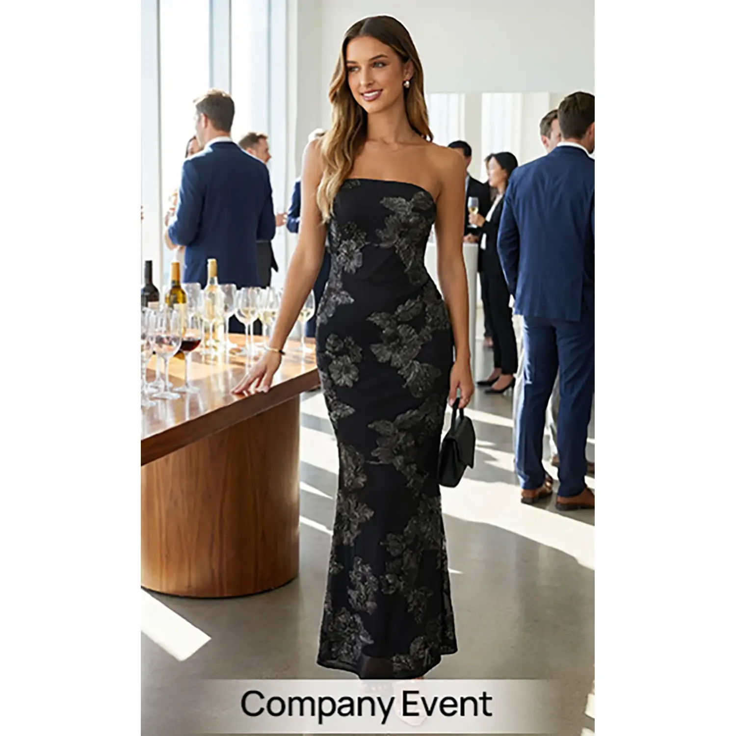 ·Size: S=US 4-6, M=US 8-10, L=US 12-14, XL=US 16-18. This dressy strapless dress is crafted 3D floral prints design, paired with an opaque liner and antislip strip. Its stretchy bodycon fit hugs the body's curves perfectly, seamlessly blending elegance and comfort. It's an ideal dress for formal occasions