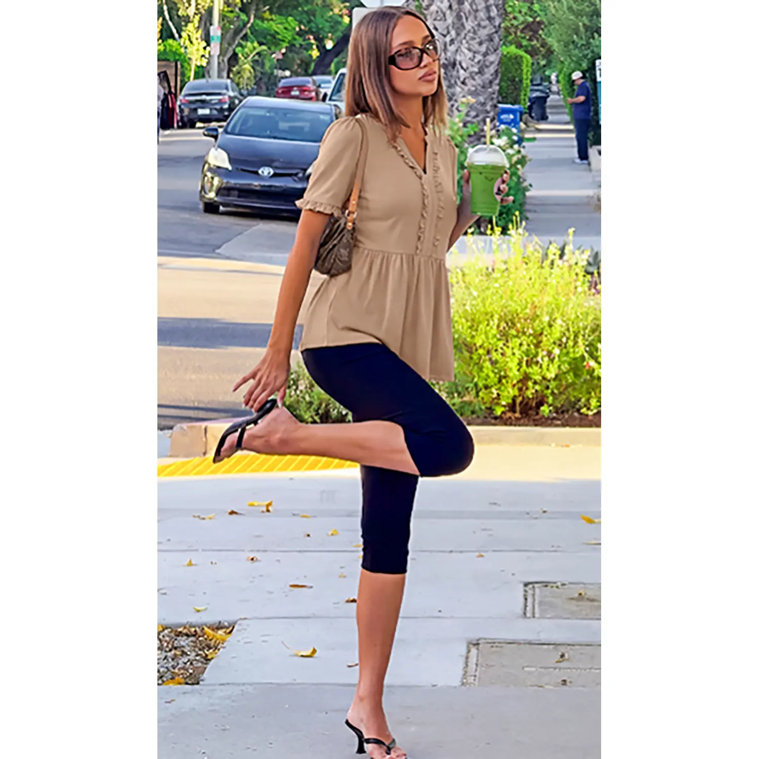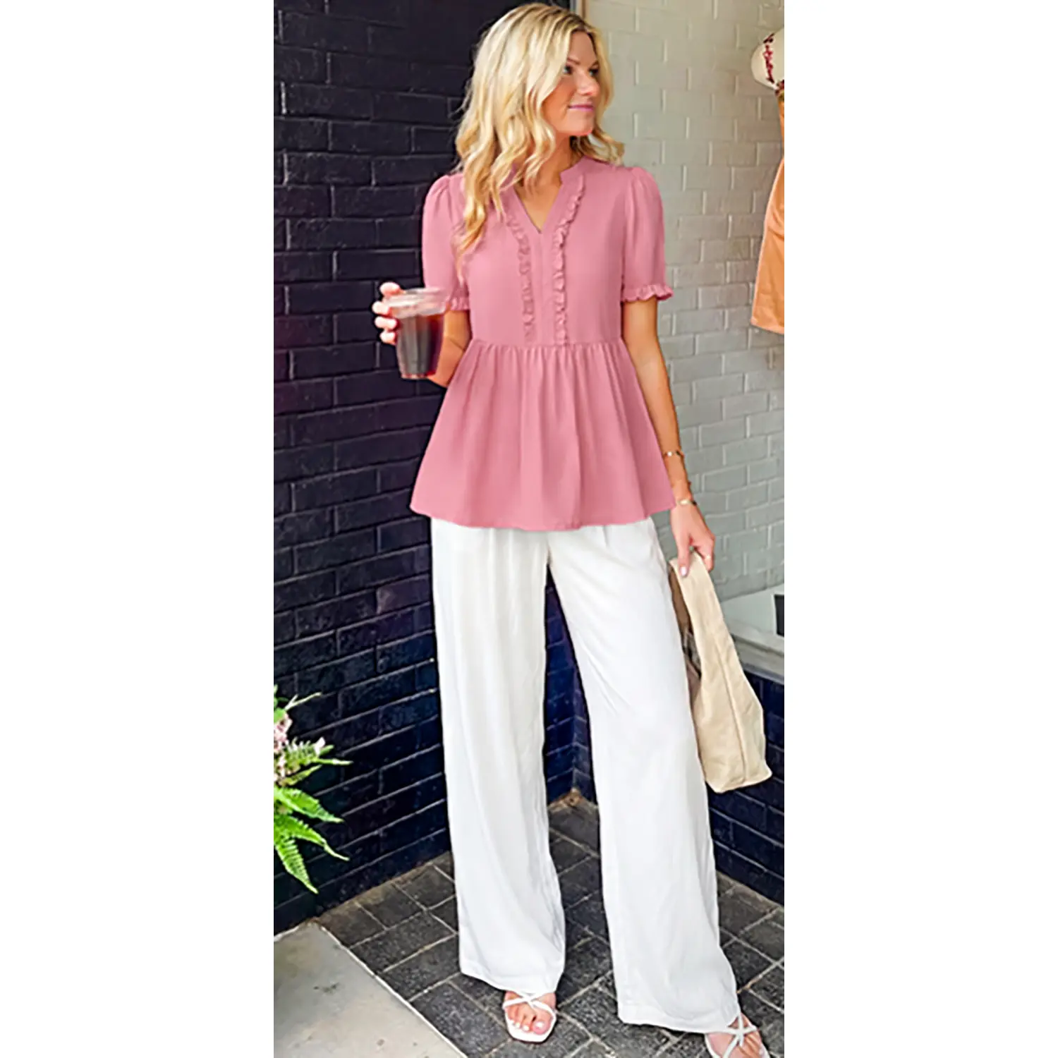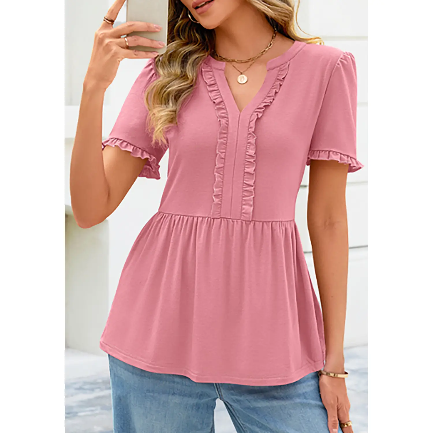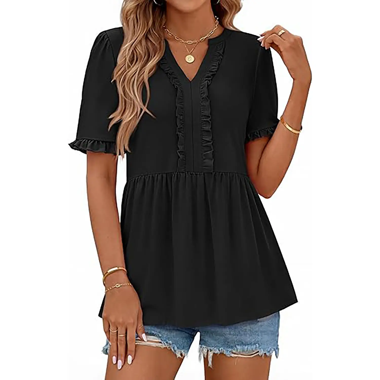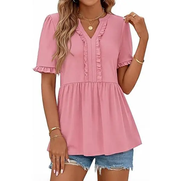 ·Features: This charming women's top features a slit v neck design accented with ruffle trim, subtly highlighting the neckline. It includes short sleeves with ruffled cuffs, adding a touch of femininity. The high waistline and pleated hem create a relaxed babydoll silhouette, offering a comfortable and flattering fit. Peplum tops for women, baby doll tops for women