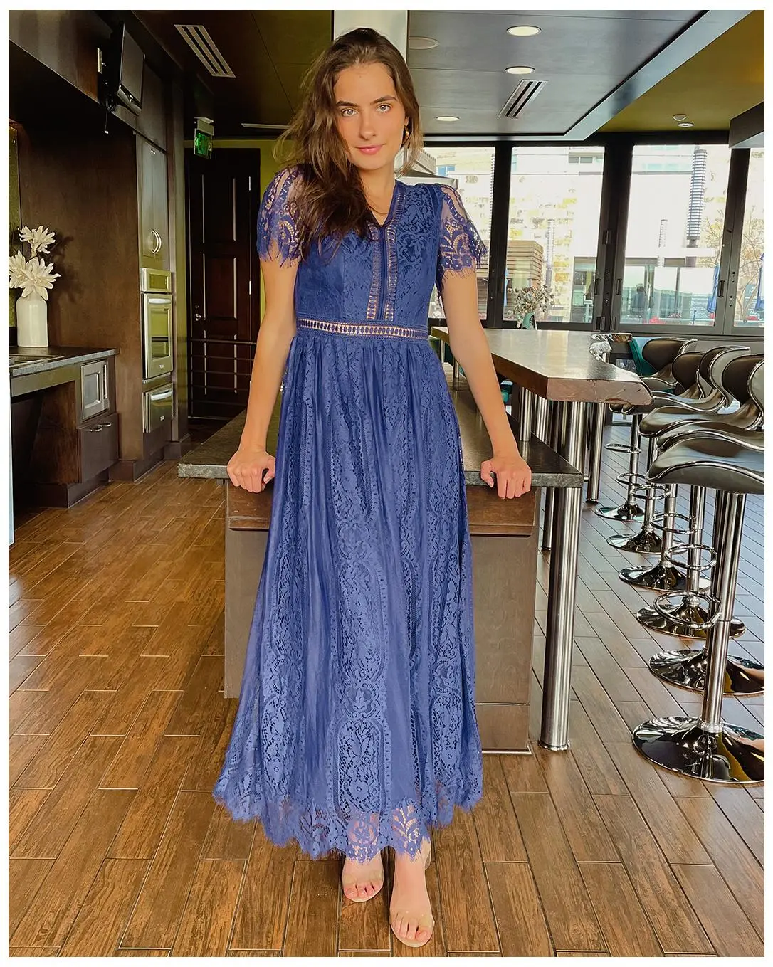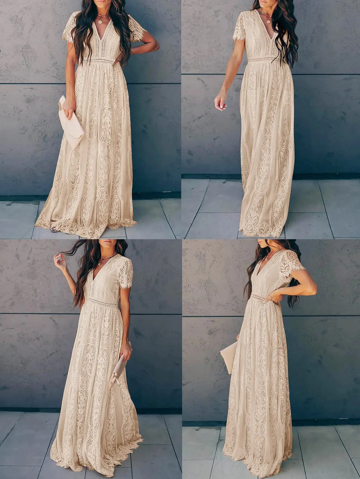 ·Features a deep V-neckline, sheer short sleeves, high waist, and full-length A-line skirt for a romantic look