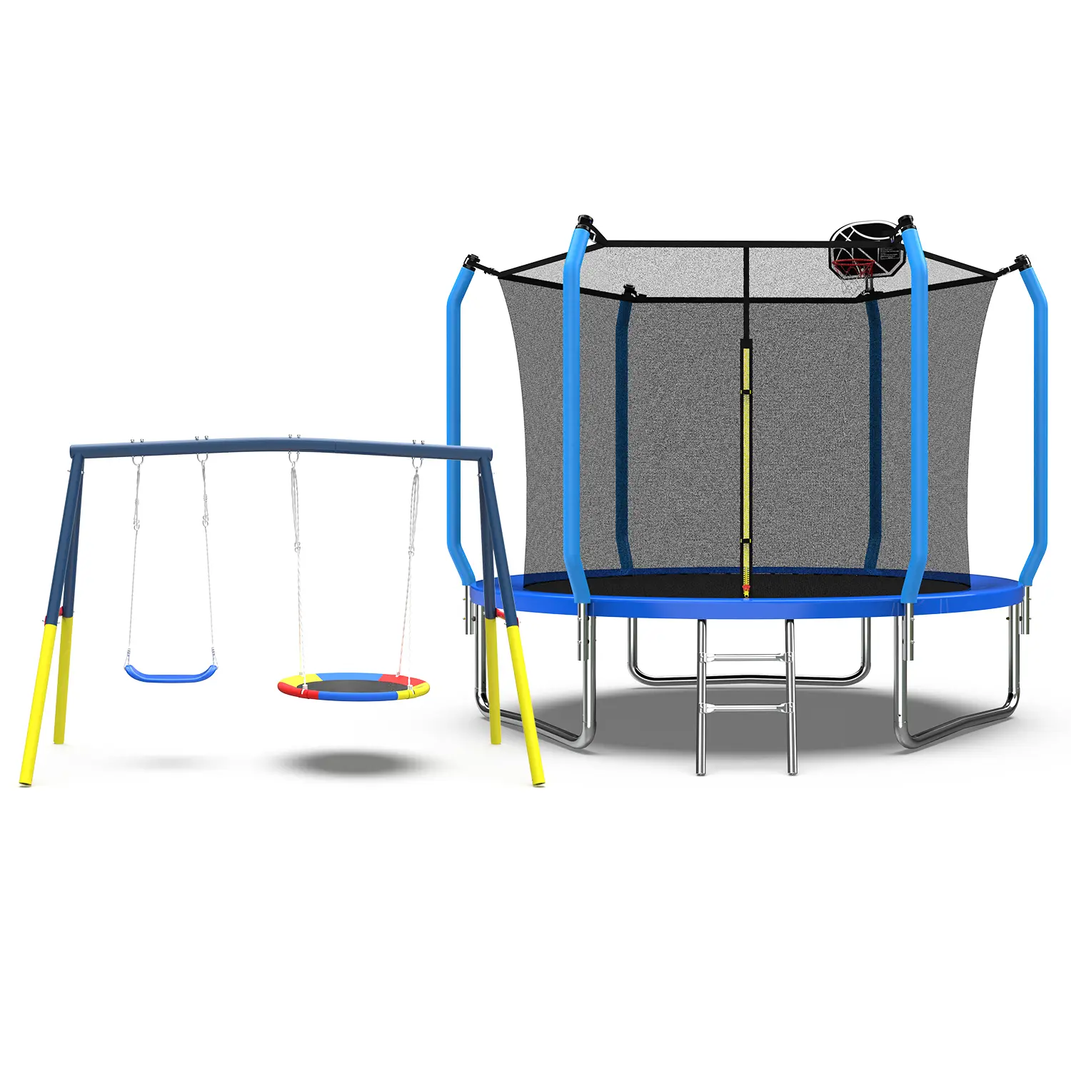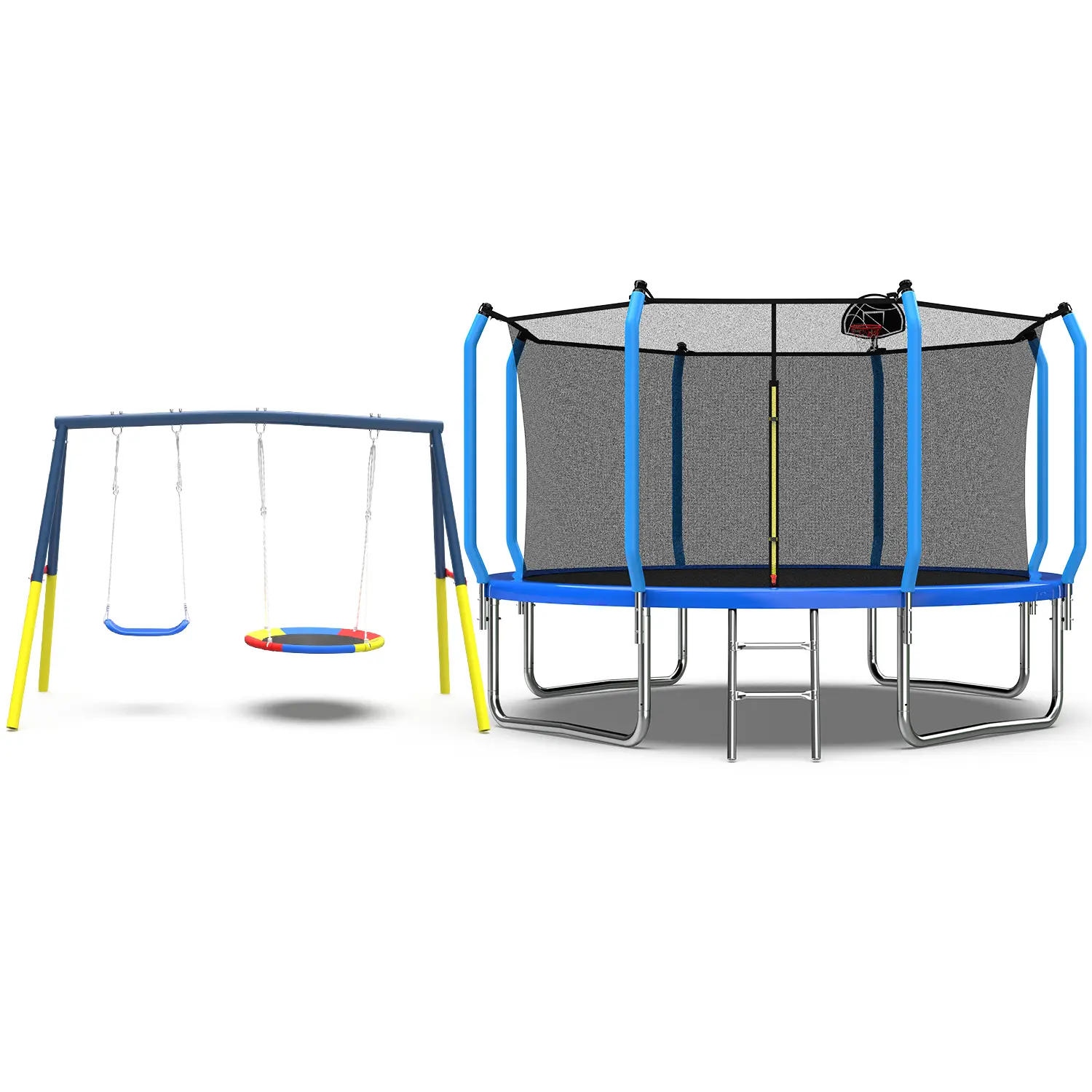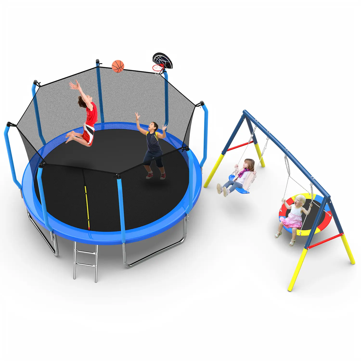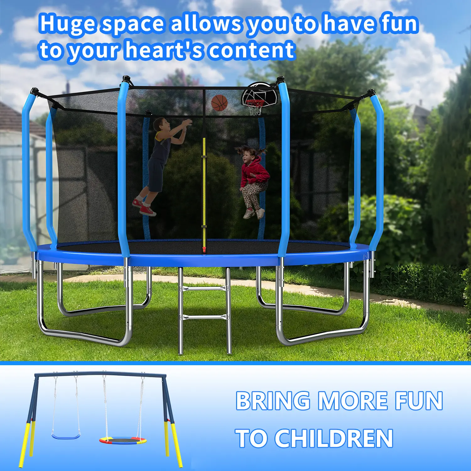 ·【Best Gift for Kids】This trampoline plus swing combination is the best gift for kids. The 12-foot high trampoline uses a thickened polyethylene fence net that surrounds the children's trampoline to ensure safety, fade resistance, and tear resistance. To better protect children and you from pinch points and openings, the fenced trampoline is also connected to PP soft foam steel pipes, eliminating the gap between the mat and the net, making it safer and happier for children to play on the trampoline. This will become a playground for children, and we provide a sturdy ladder so that they can easily and safely get on and off the trampoline. The swing frame is equipped with a 32-inch flying saucer swing and a 26.2-inch swing seat, which is ideal for backyard swings. Parents can spend a happy time with them. Keep your children away from computer games and TV.