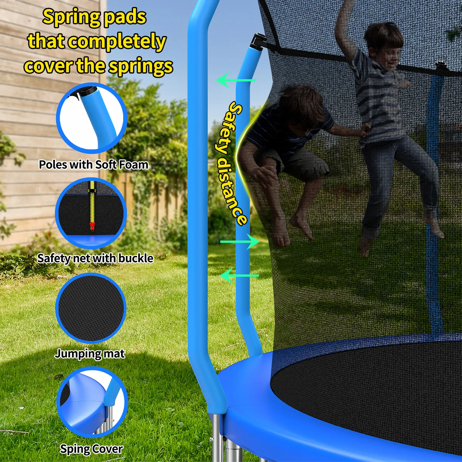 ·【Removable ladder, super load-bearing】Mersco trampoline uses durable reinforced galvanized springs, and the jumping pad provides greater load-bearing capacity and bouncing ability. After being tested by our team for more than 30,000 jumps, this outdoor trampoline has a maximum load-bearing capacity of 1320 pounds and can accommodate 5 children. It also comes with a trampoline with a ladder, making it easier for you to get on and off.