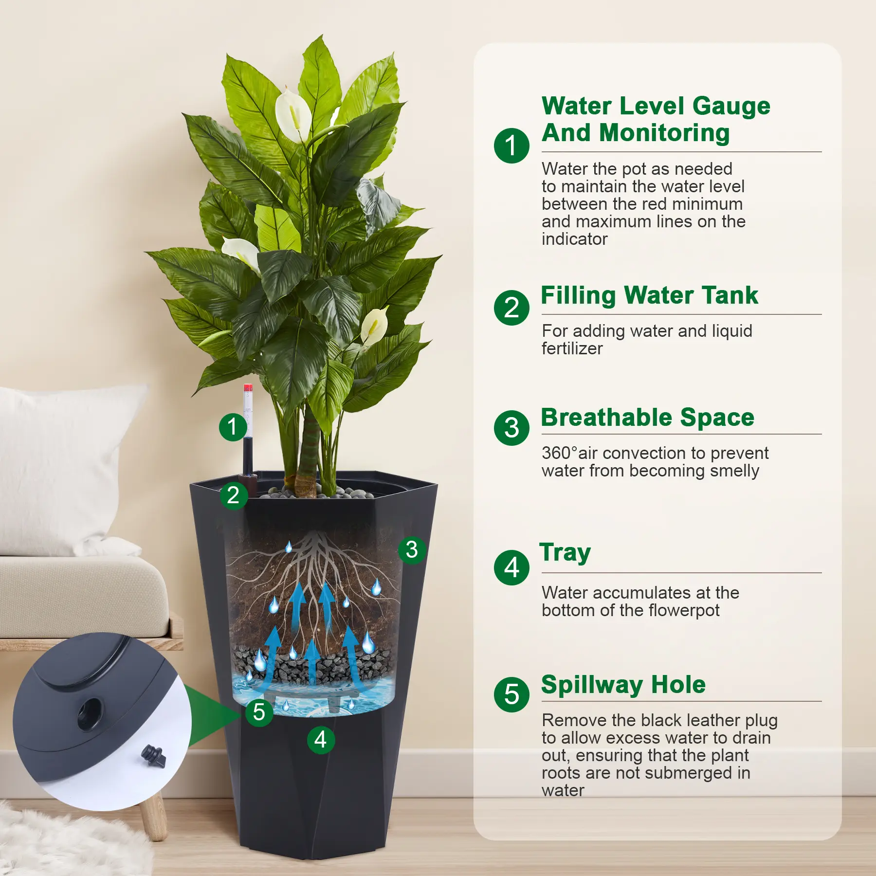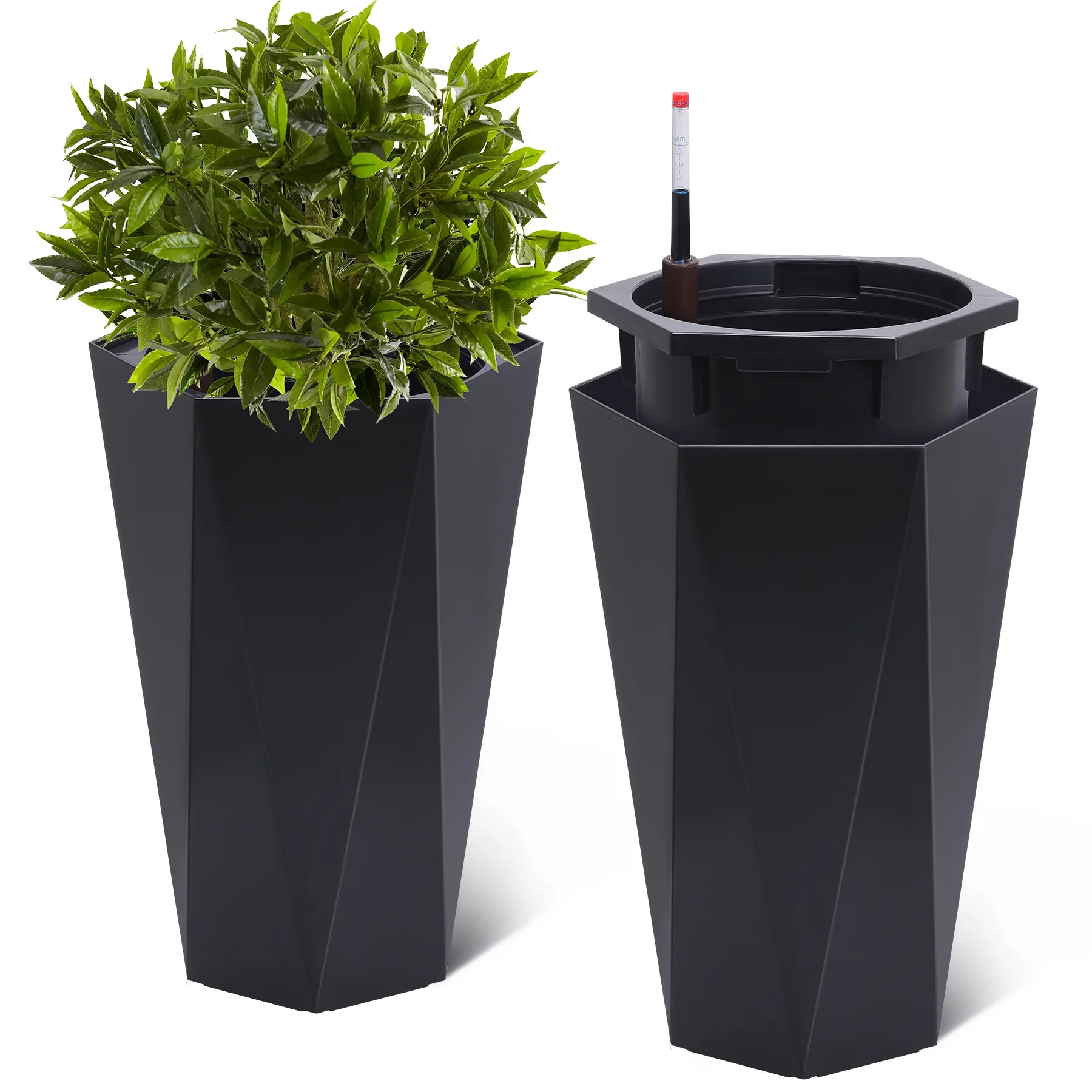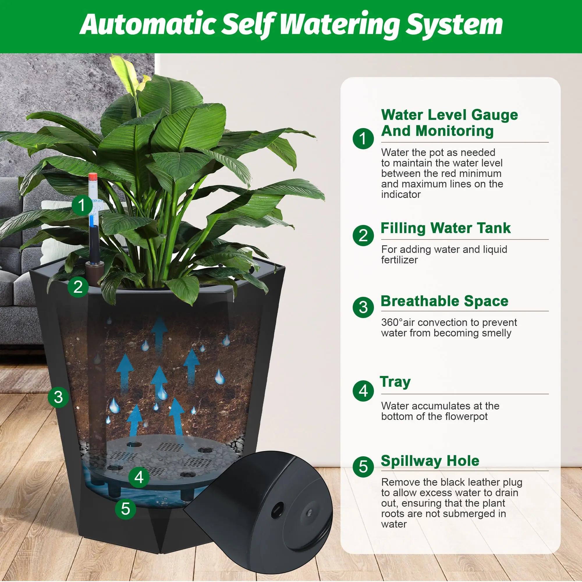 ·Self-Watering System: Each planter features built-in drainage holes and a water reservoir, allowing for automatic watering and healthy root growth. The integrated water level monitor lets you know when it’s time to refill, reducing the risk of root rot and keeping your plants thriving, even during busy weeks or travel.