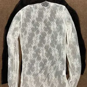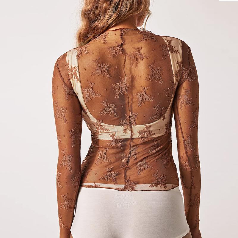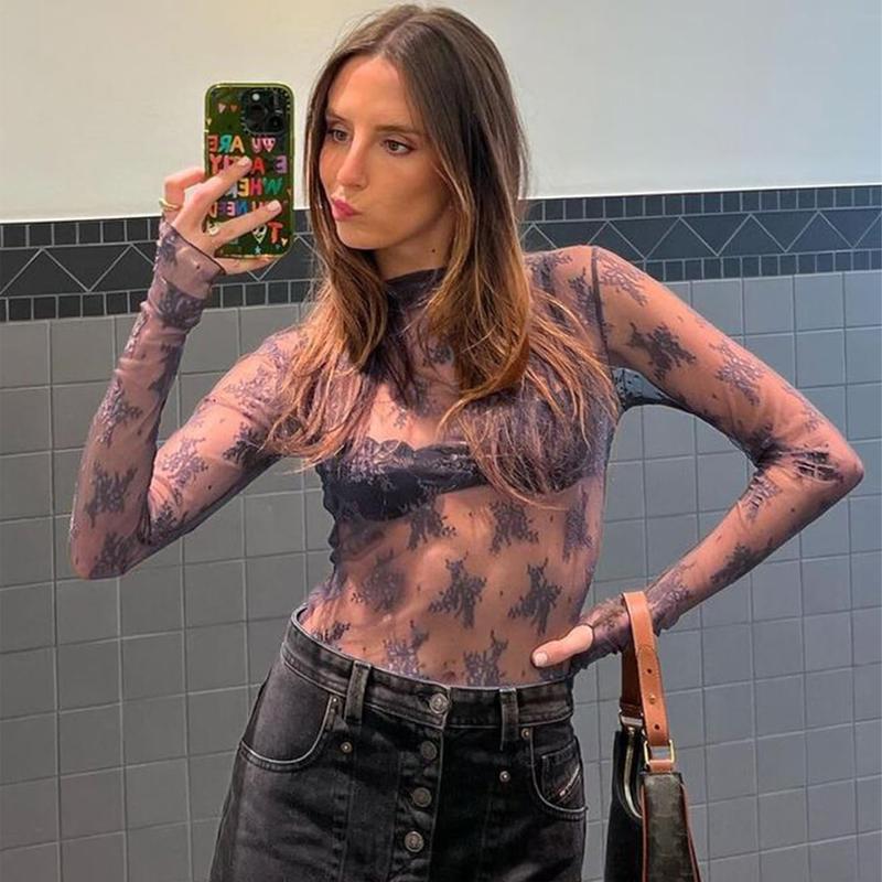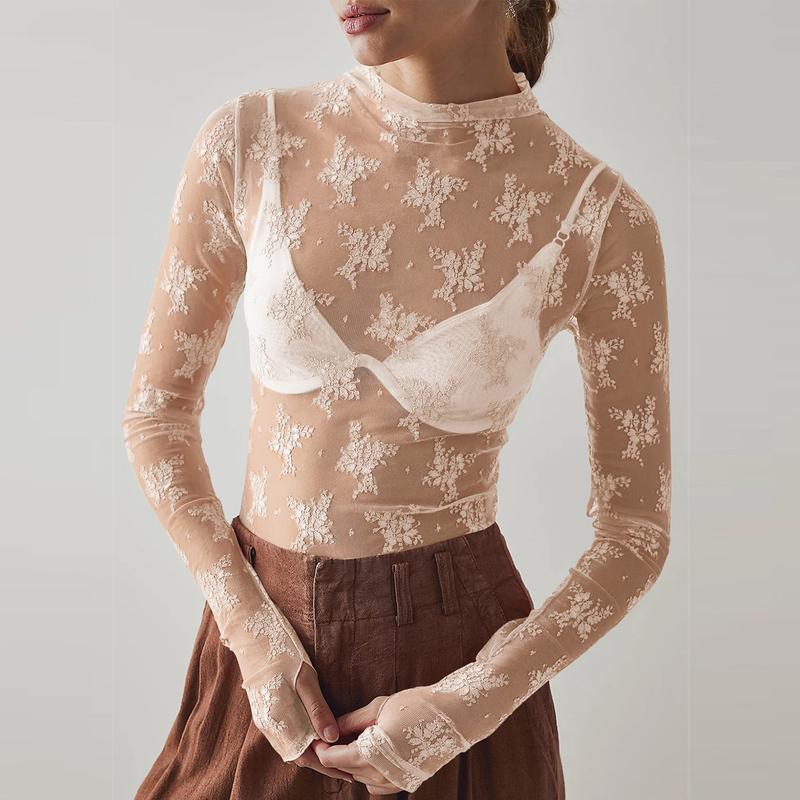 ·Pull on closure for easy wear. Long sleeve with thumbhole for comfort. Mock neck design. Floral embroidery adds a touch of elegance. See-through mesh layering top. Slim fit for a stylish look. Sexy mesh for a chic appearance.