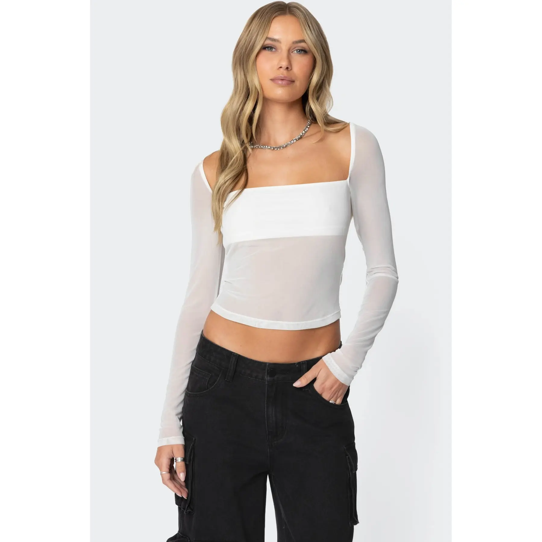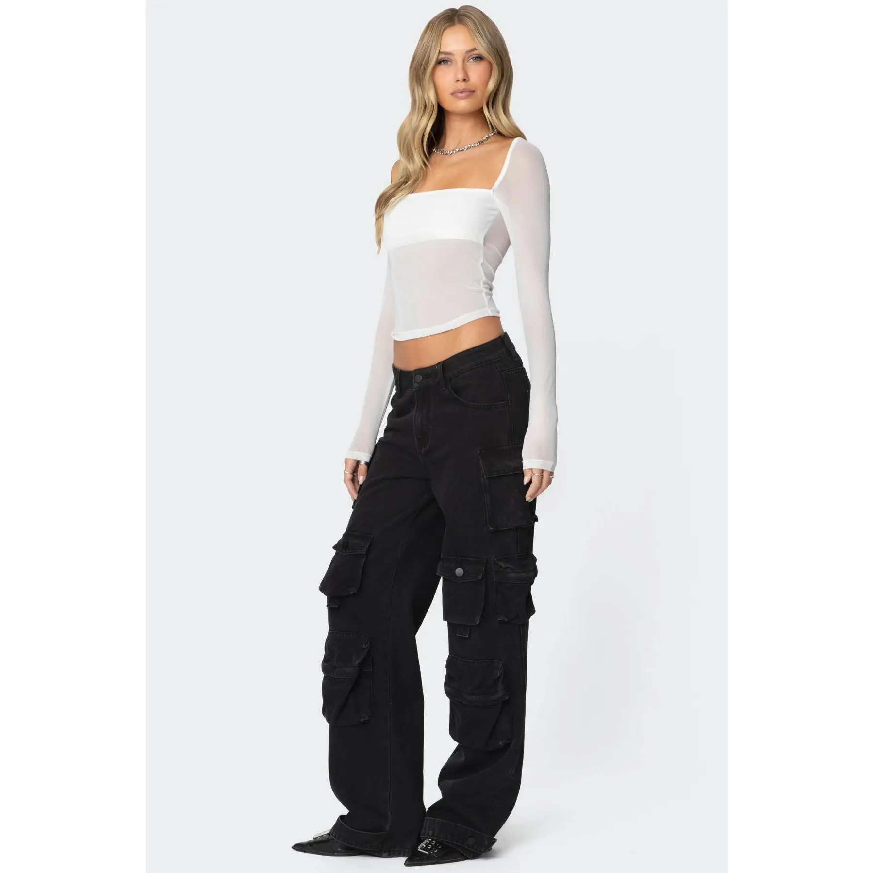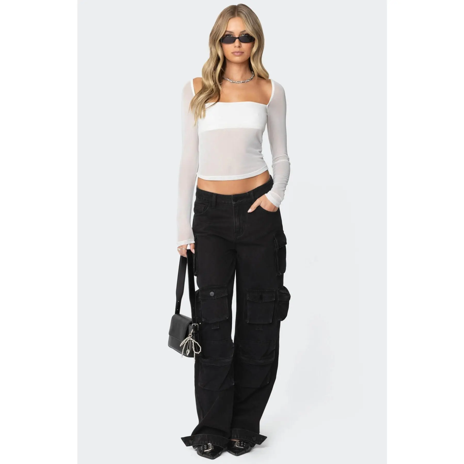 love me a good monochrome moment & a parachute pants outfit 🤍  #parachutepants #ediktedtop #edikted #y2kfashion #leopardprint  parachute pants outfits, mesh top long sleeve, winter outfits 2024, monochromatic outfits, white mesh top
