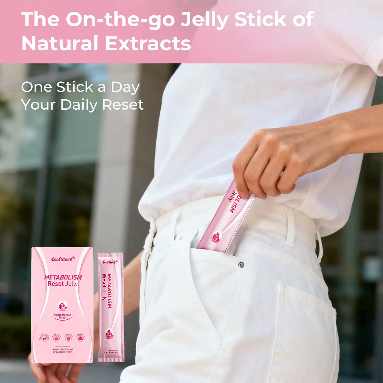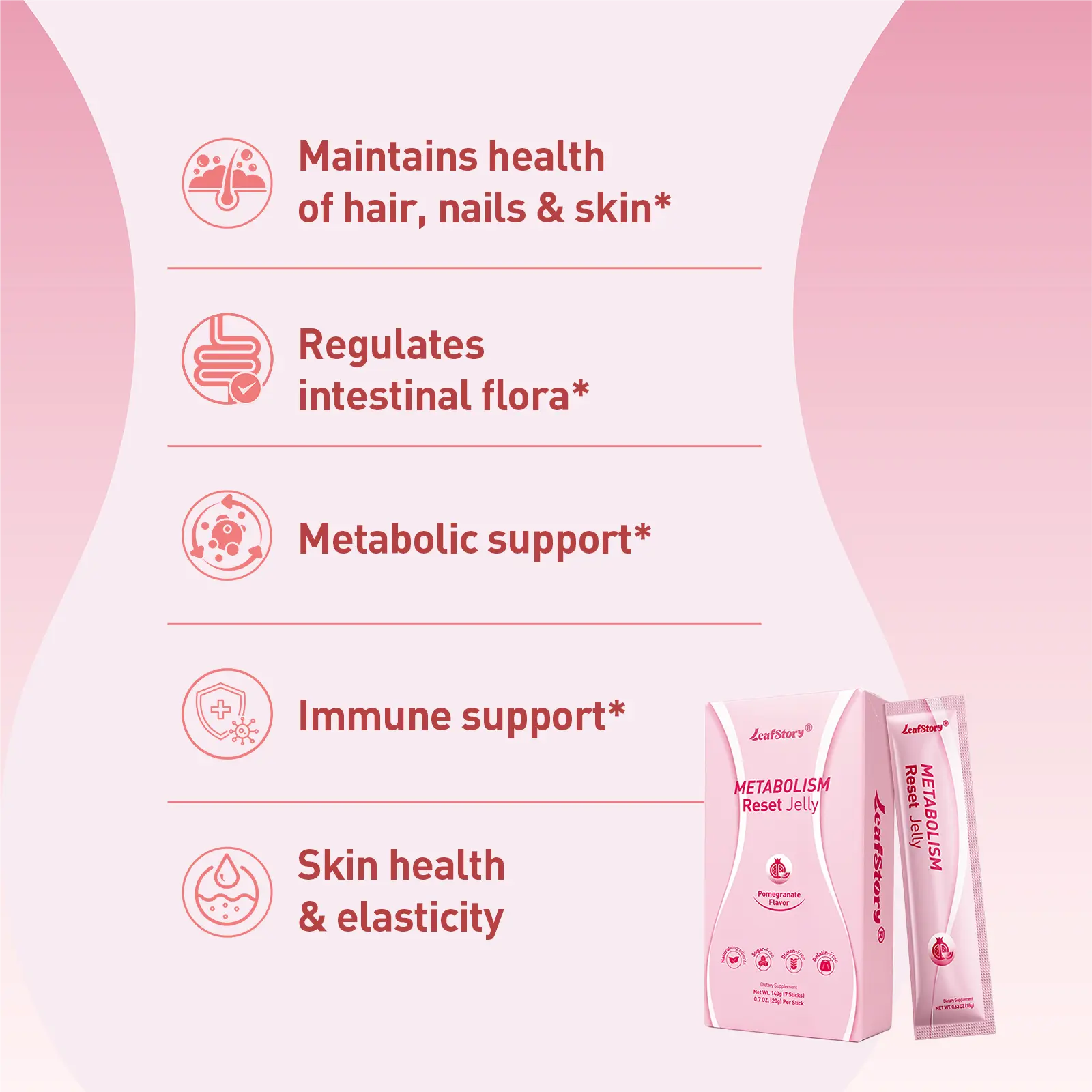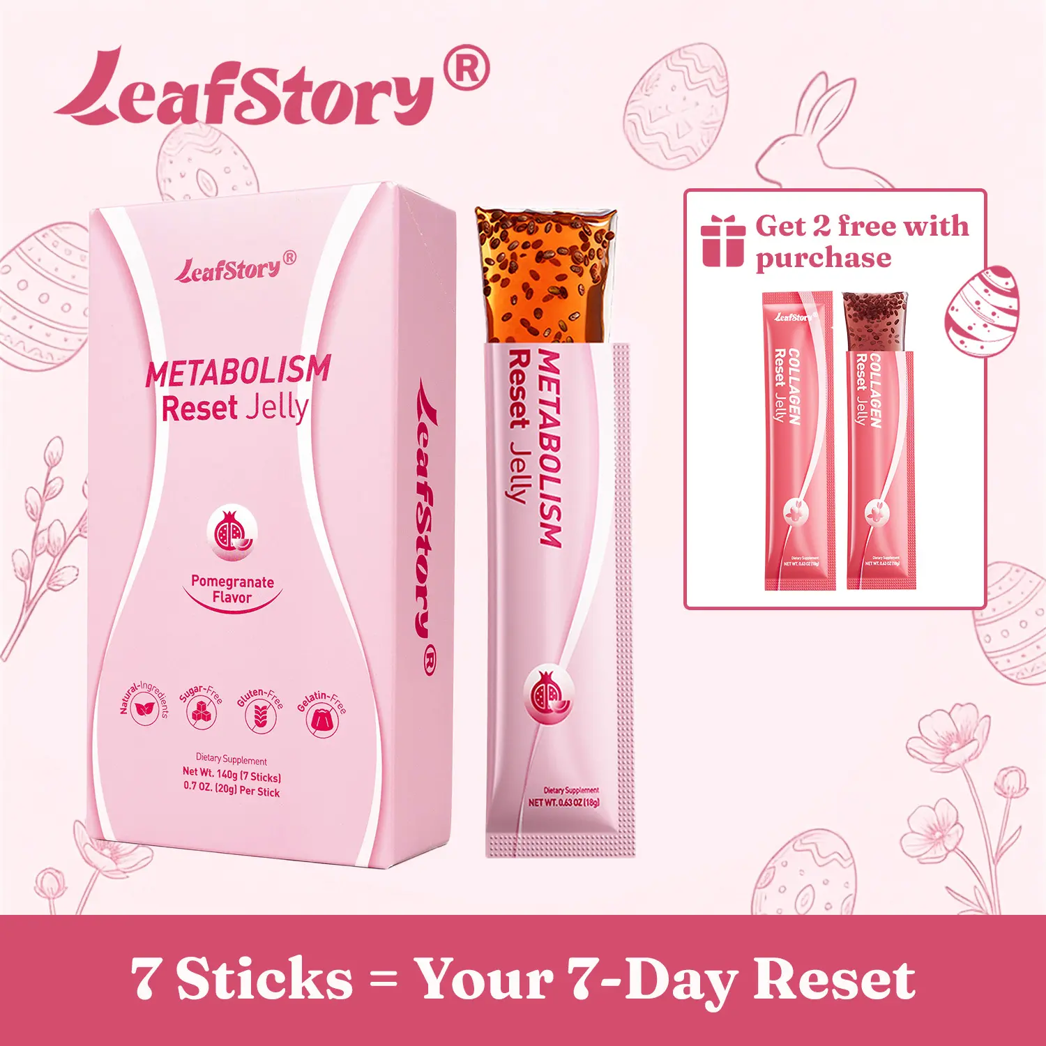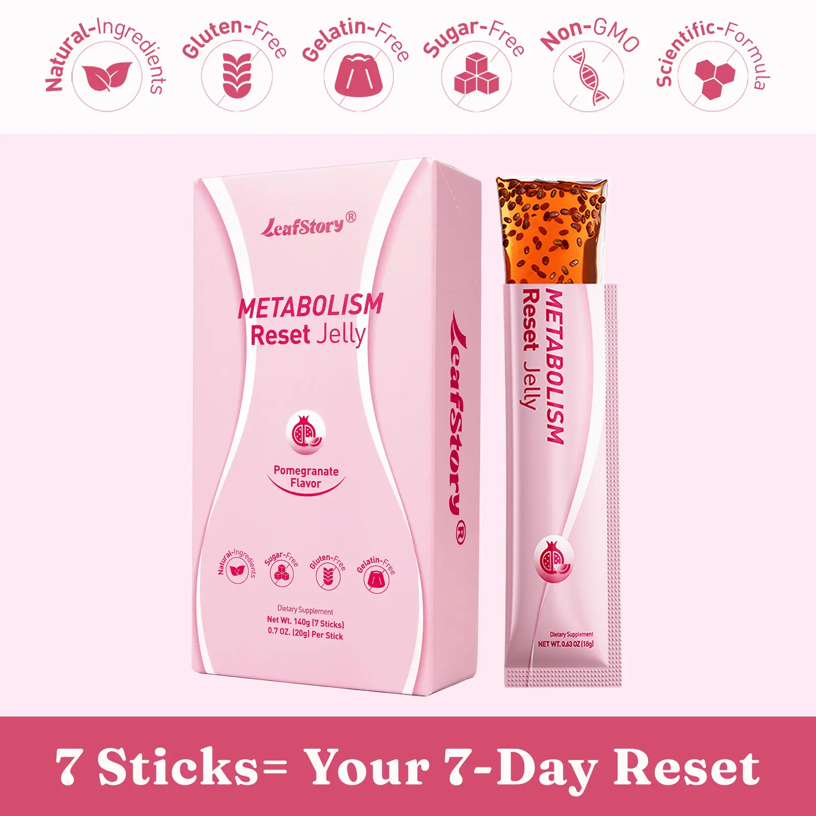 LeafStory Metabolism Reset Jelly (7 Sticks): Pomegranate Flavor, Support Metabolism & Energy, Support Digestion & Gut Health, Sugar-Free, Skin Elasticity, Hair & Nails, Gluten-Free, Non-GMO, Gelatin-Free-F