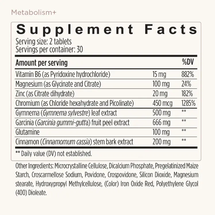 Cinnamomum cassia (Cinnamon) extract (stem bark), Garcinia gummi-gutta extract (fruit peel), Gymnema sylvestre extract (leaf), Pyridoxine hydrochloride (Vitamin B6), Chromic chloride hexahydrate, Chromium picolinate, Magnesium citrate, Magnesium glycinate, Zinc citrate dihydrate, Glutamine, Microcrystalline cellulose, Hypromellose (coating), Maize starch, Croscarmellose, Colouring (iron oxide red).