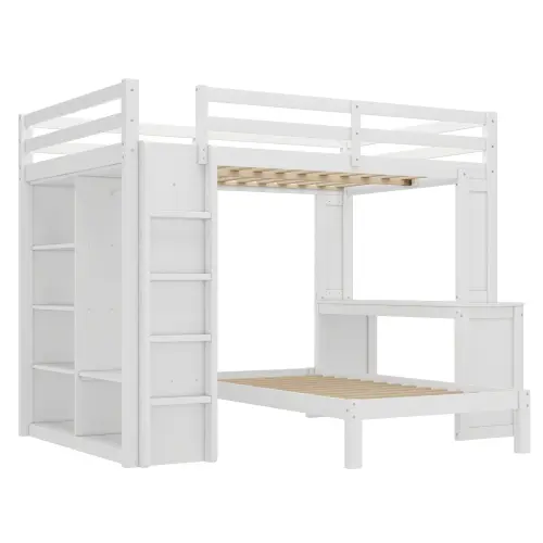 ·Ample Storage with Built-in Shelves & WardrobeThis full loft bed features integrated shelves and a wardrobe, offering abundant space for clothes, books, and daily essentials. Perfect for maximizing storage in bedrooms, dorms, or guest rooms without adding extra furniture.