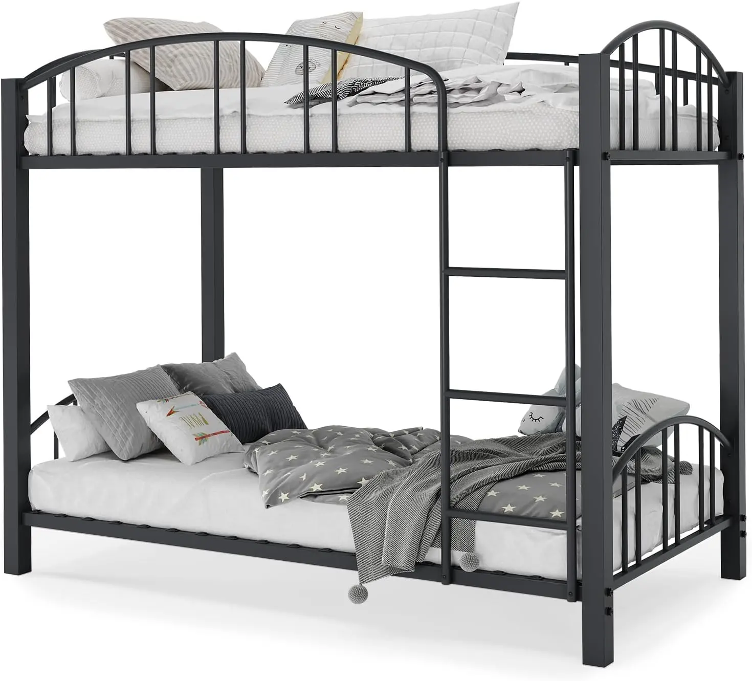 Metal Bunk Bed Twin Over Twin Heavy Duty Bunkbeds Frame with Arched Guardrail and Safety Ladder Sturdy Steel Bed for Kids Boys Girls Space-Saving No Box Spring Needed Matte Black Storage Shelf Headboard Furniture
