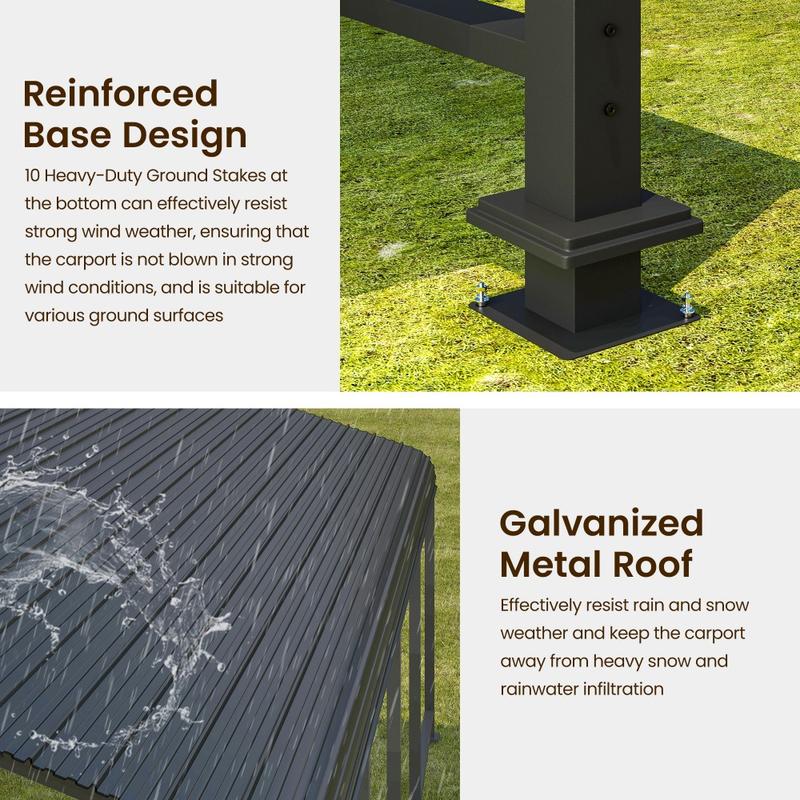 This carport features a high-strength metal frame with reinforced support bars at the bottom, ensuring stability and safe use. The thick iron plates and rubber edging around the edges provide added weight-bearing capacity and protection. The waterproof strips and UV-resistant coating keep your vehicle dry and safe in any weather. Whether it's rain, snow, or intense sun, this carport offers all-weather protection, allowing you to park with peace of mind and enjoy secure, stable coverage.