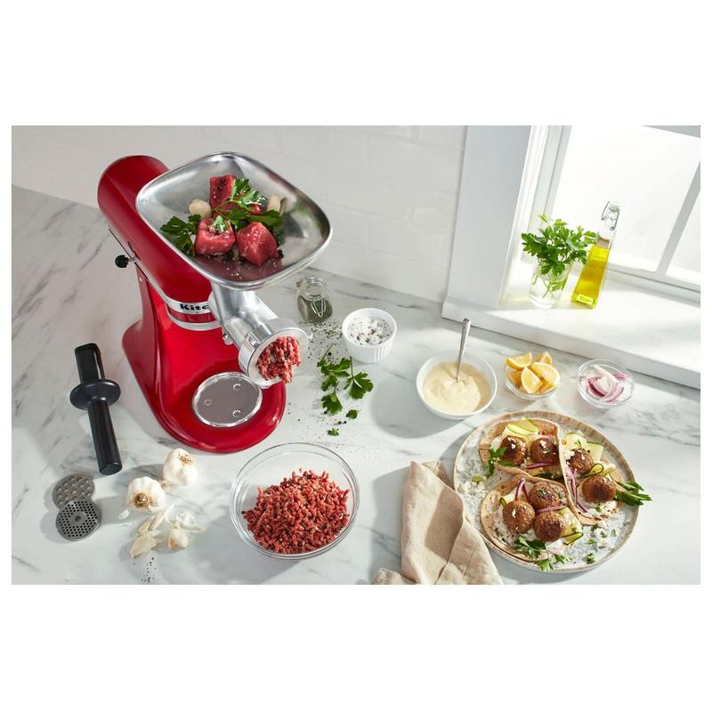 Transform your KitchenAid stand mixer into a versatile food grinder and sausage maker with the KitchenAid Metal Food Grinder Attachment. Designed for seamless compatibility with all KitchenAid stand mixer models, this attachment not only grinds a variety of foods but also lets you create fresh, flavorful sausages right in your kitchen. From the durable all-metal construction to the comprehensive kit including three grinding plates and two sausage tubes, discover the joy of homemade culinary creations with this essential kitchen tool. From KitchenAid.