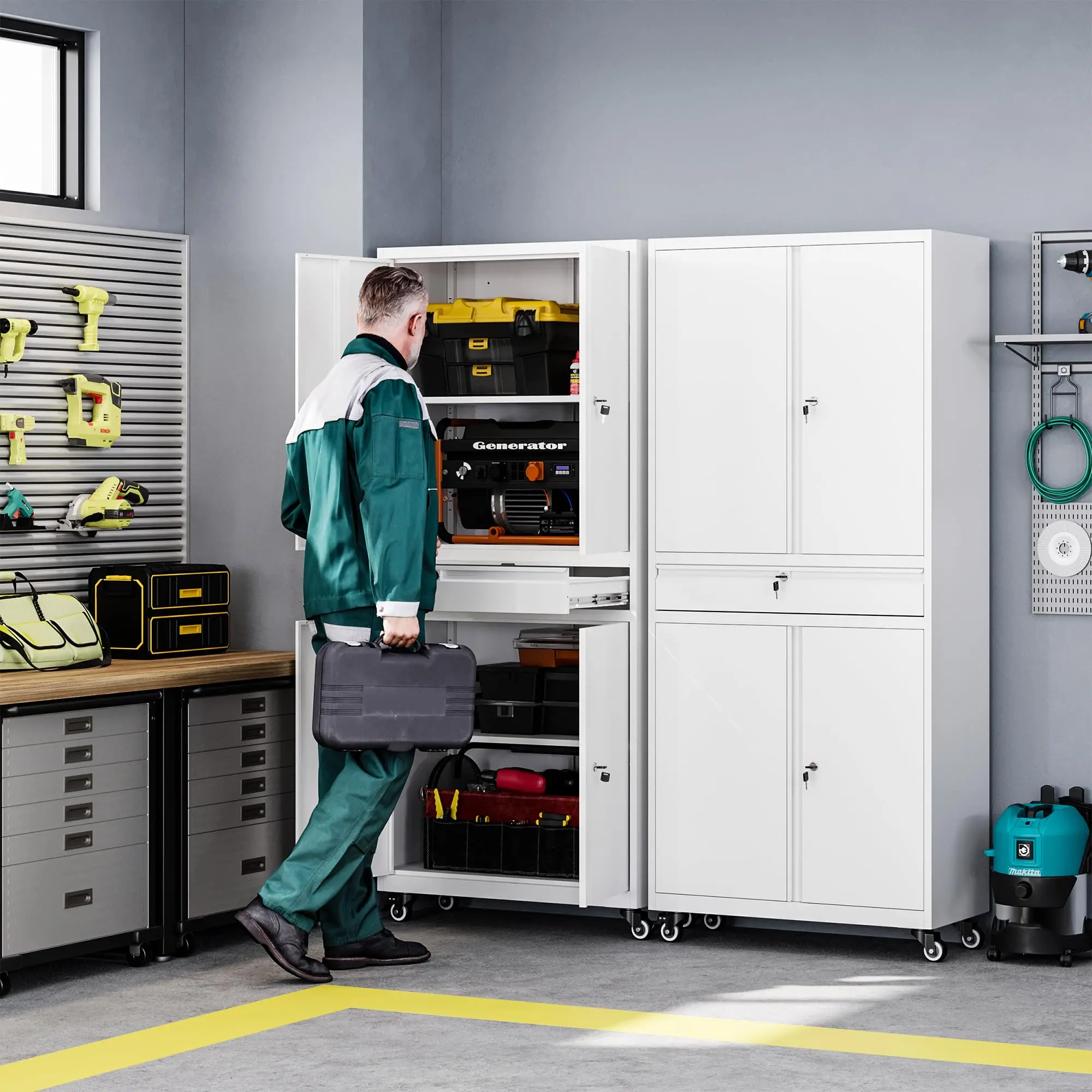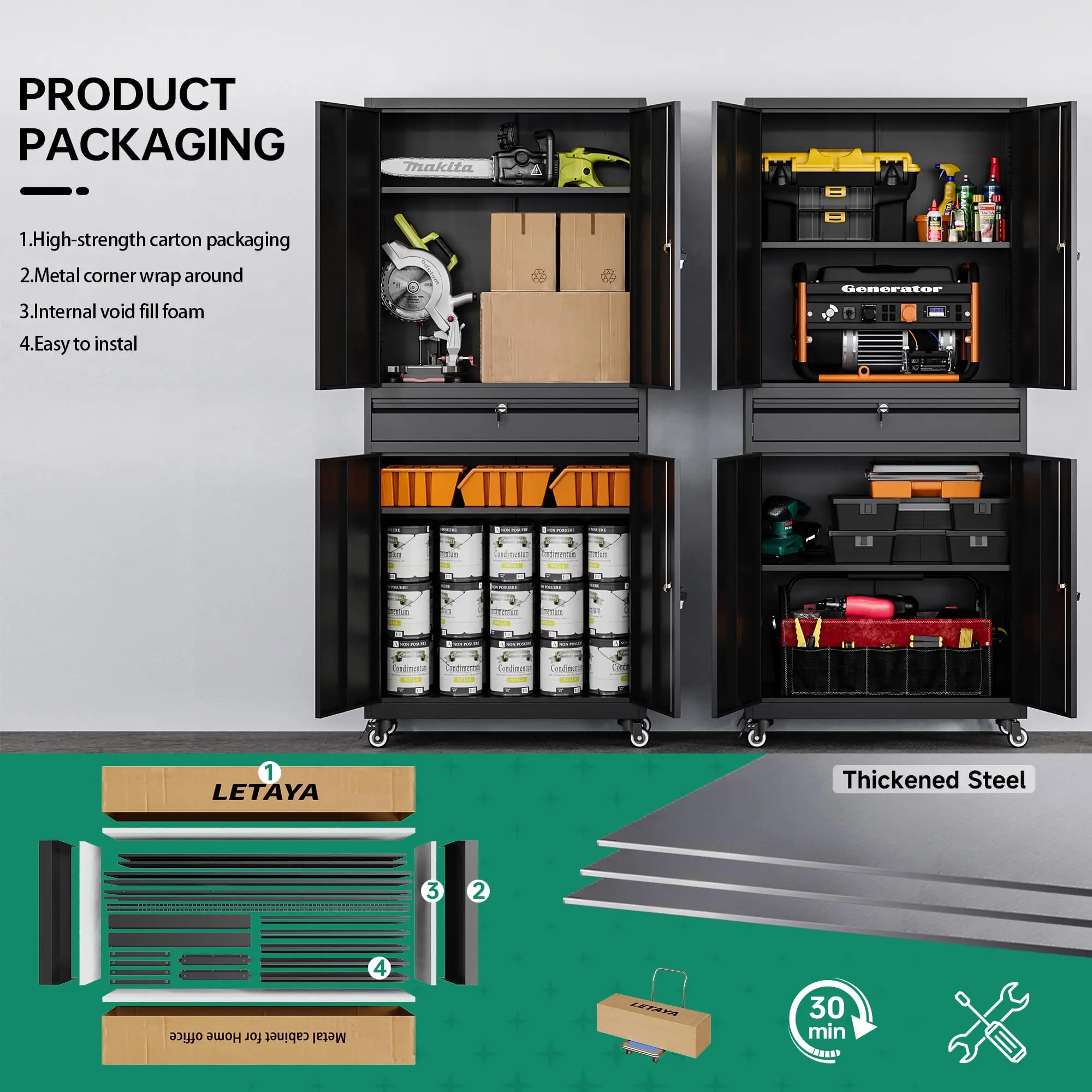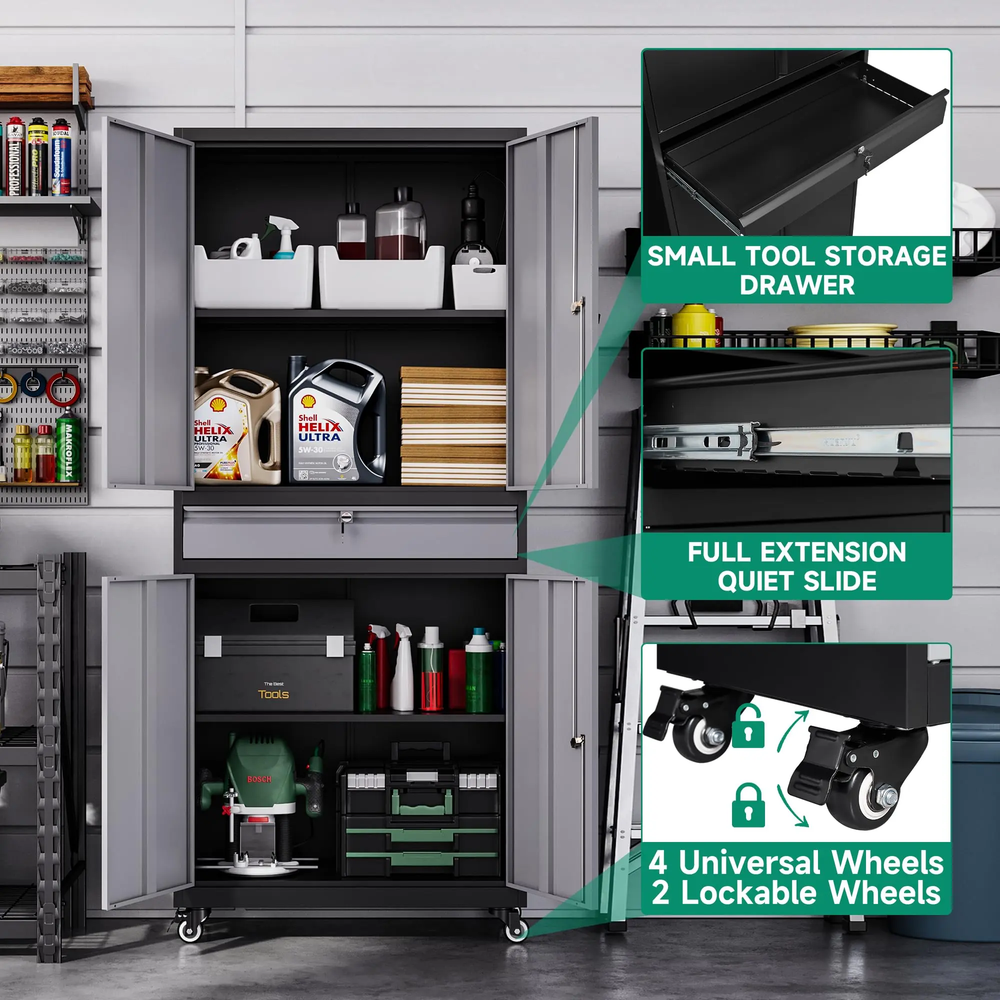 ·【Versatile Usage】Equipped with 4 detachable 360° rollers (2 lockable) to help you move the cabinet at will, suitable for homes, offices, garages, schools, shops, warehouses or other commercial spaces.