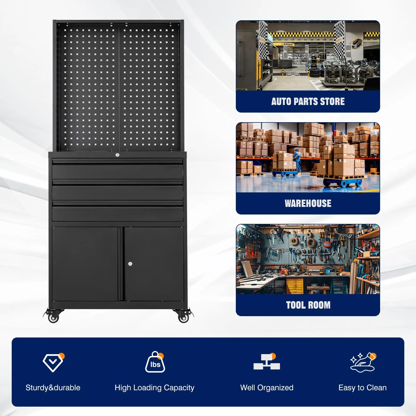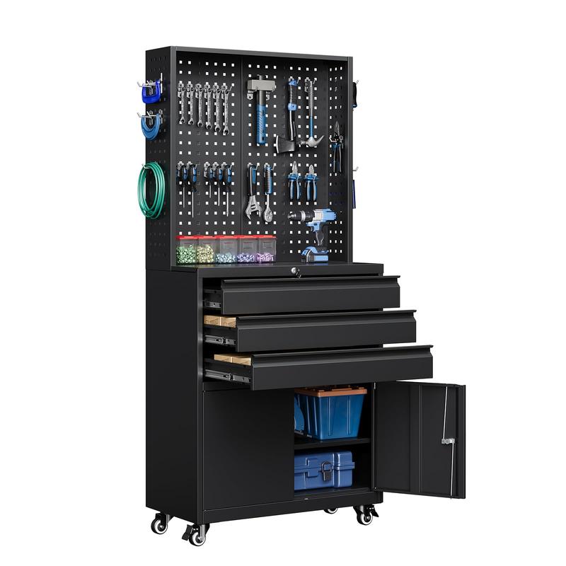 ·[Large Capacity for Tool Storage]Our tool organizer has strong load-bearing capacity, 3 drawers, bottom cabinet, side tool rack and 4 removable hooks provide ample storage space for various tools such as screwdrivers, spanners, boxes, etc.