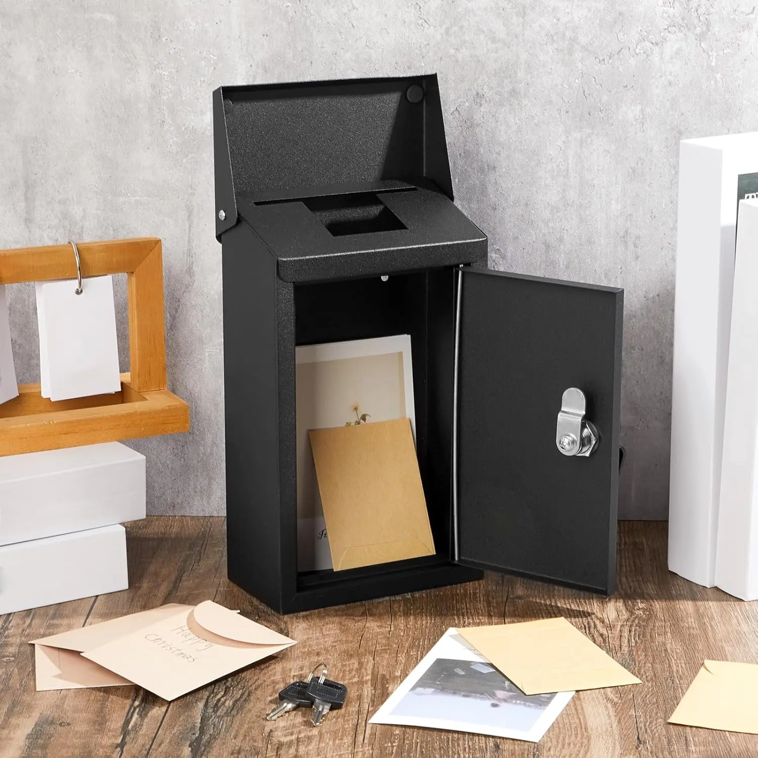 High : our mail box with can withstand the impact of bad weather, will not be easily broken and deformed, the top can put letters, , checks and so on, you can rest assured to put them inside, you can use the key to open the lid to take them out