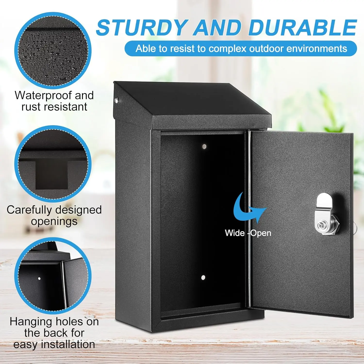 Humanized Design: the top of our locked mailbox for outside is designed with a rainproof cover, which can effectively rain from entering the mailbox; There is a small square mouth under the cover, which can facilitate your daily delivery of letters and other items; The keyhole design of the product is on the front, which can facilitate you to take out the items in the mailbox at any time