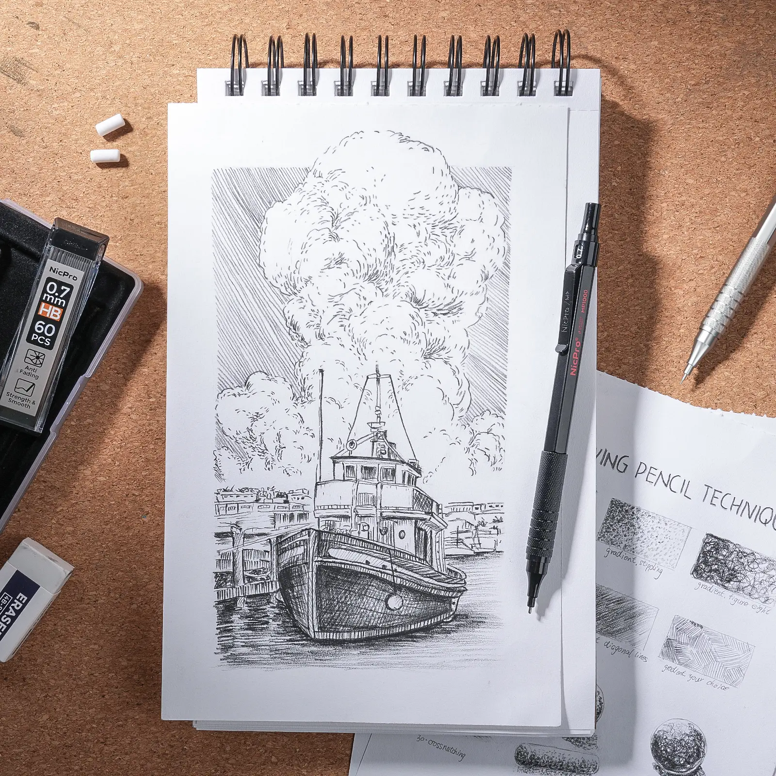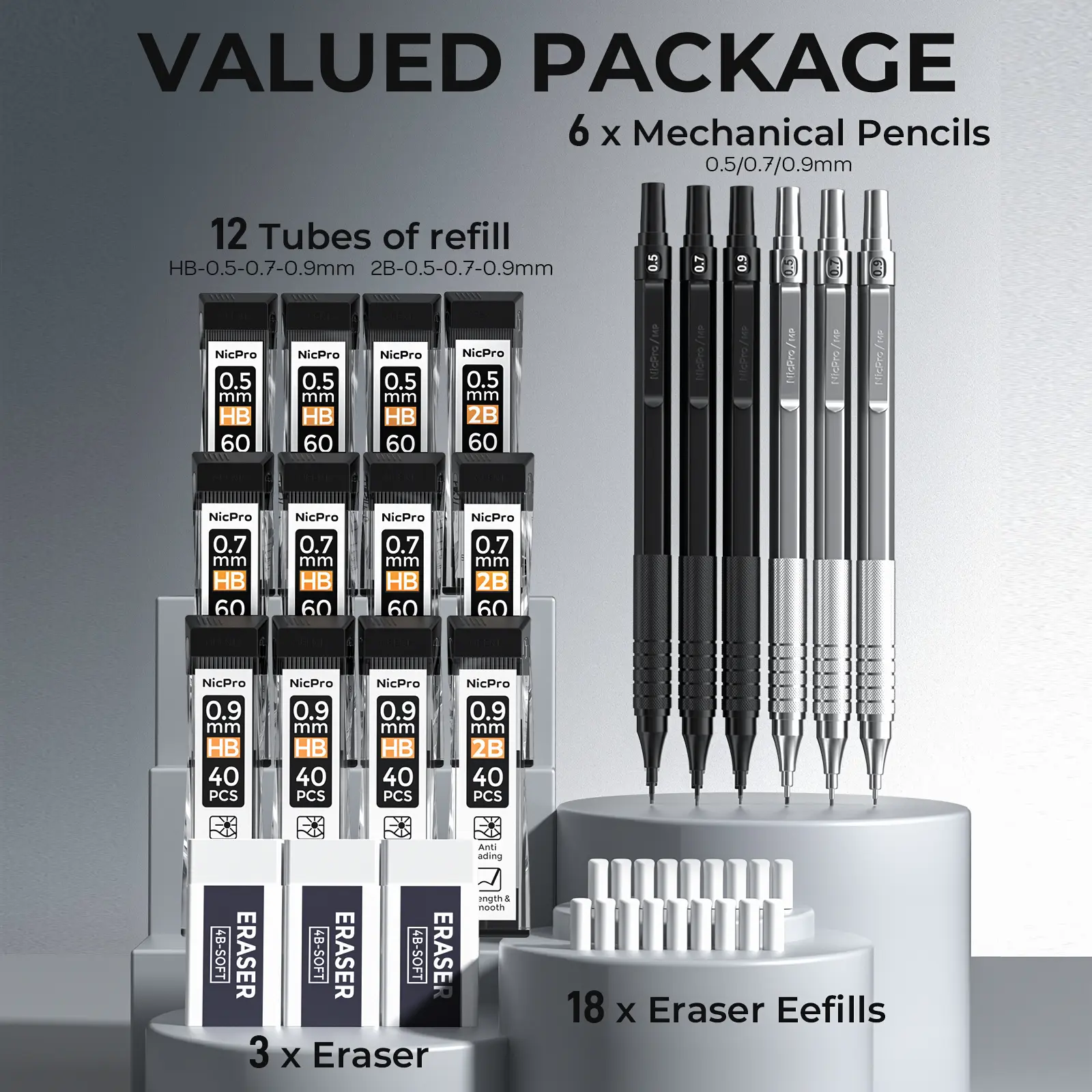 This Nicpro set includes 0.5, 0.7, and 0.9 mm metal mechanical pencils. It comes with 6 packs of MP1000 artist lead pencils, 12 HB & 2B lead refills, and 3 erasers. Ideal for architecture, art, writing, drafting, sketching, and drawing. The set is housed in a convenient case for easy storage.