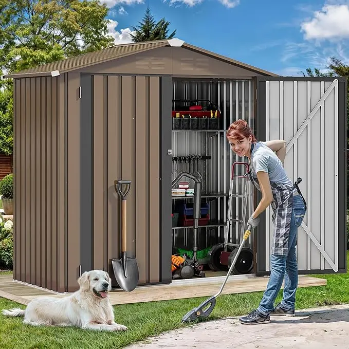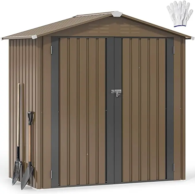 Weather Resistant: Thickened galvanized steel and a durable frame ensure excellent rust and weather resistance for this bike storage shed. Overlapping panels and a sloped roof prevent water buildup or leakage, and a sturdy metal base resists external pressures to maintain stability for year-round durability.