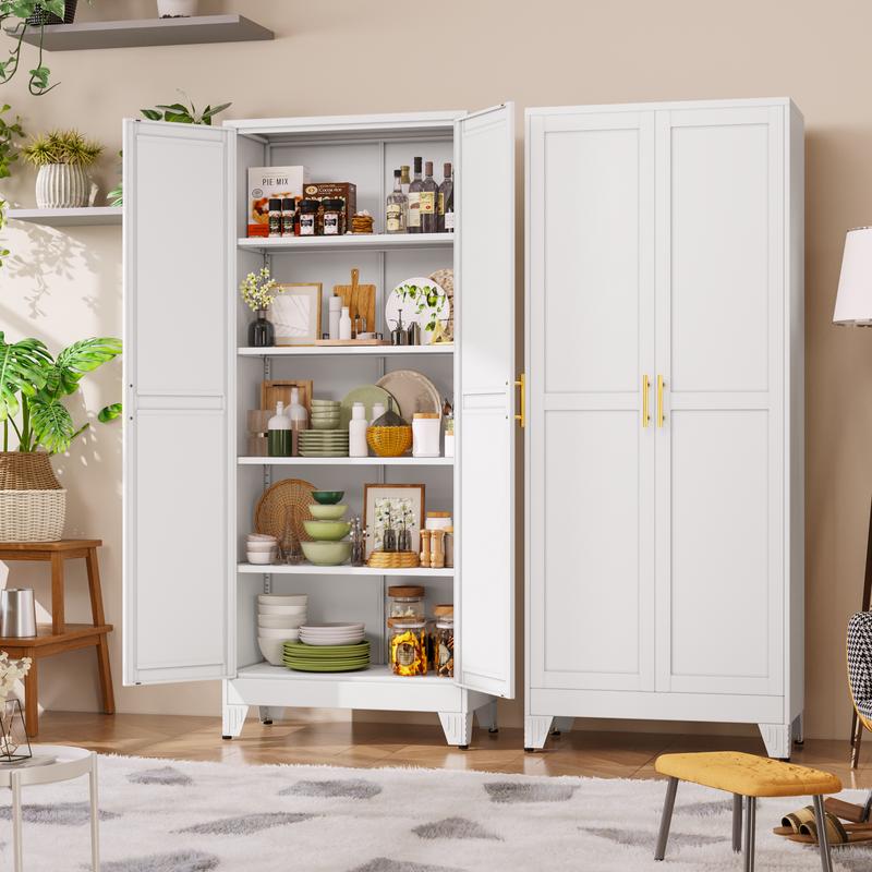 Premium Construction:Crafted from heavy-gauge cold-rolled steel plate, our metal pantry cabinet resists chipping, rust, and corrosion for exceptional longevity.The durable electrostatic powder-coated finish ensures easy cleaning and lasting durability.