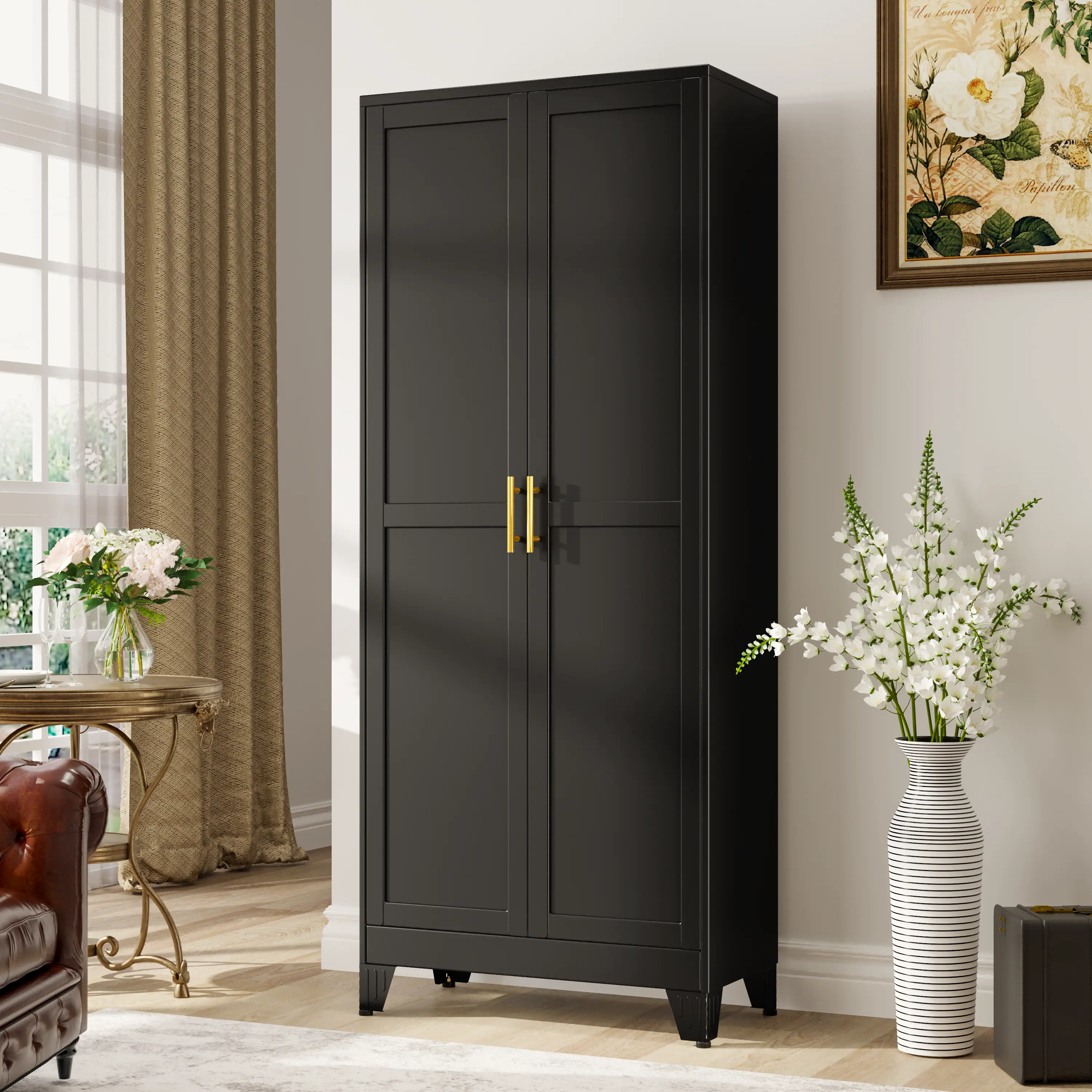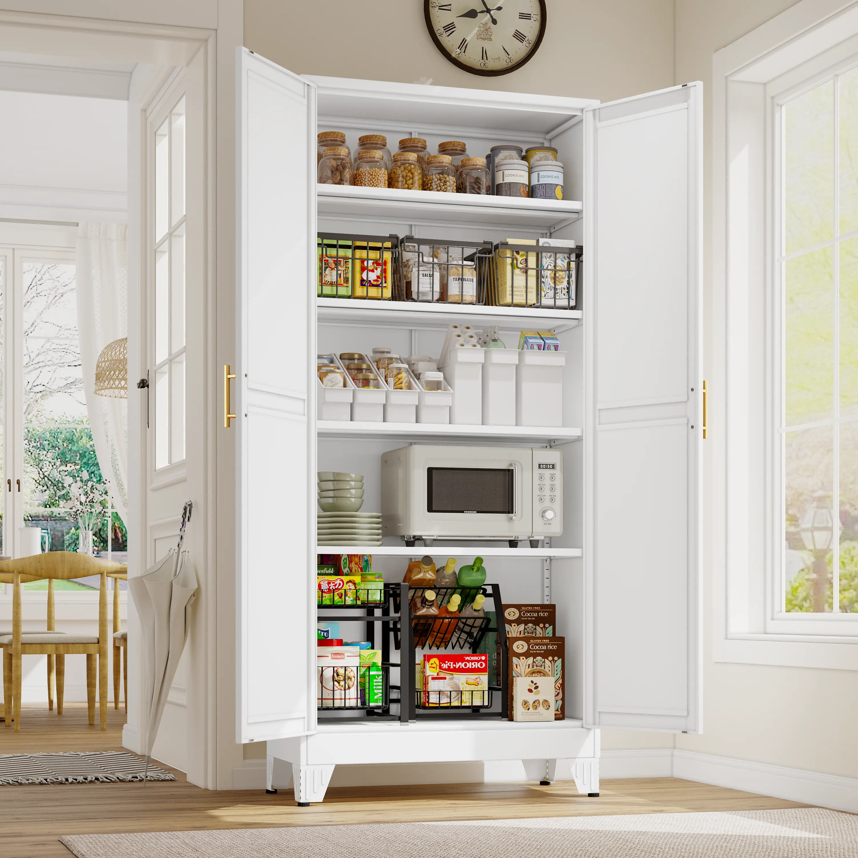 Premium Construction:Crafted from heavy-gauge cold-rolled steel plate, our metal pantry cabinet resists chipping, rust, and corrosion for exceptional longevity.The durable electrostatic powder-coated finish ensures easy cleaning and lasting durability.