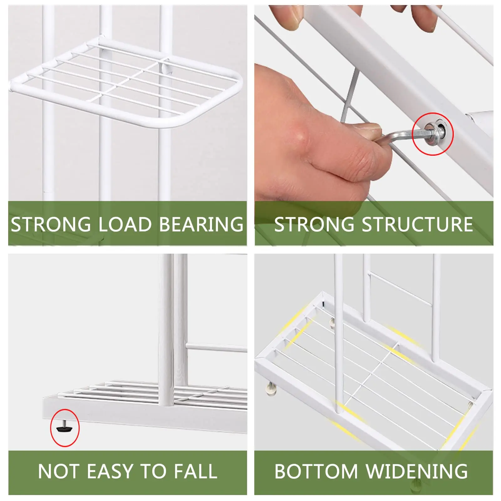 With a grid layout, this stand offers uniform load-bearing, preventing deformation. The widened base optimizes space usage, while round foot pads prevent floor scratching and maintain balance. Measuring 16.93L x 8.66W x 32.28H inches, it comfortably holds up to 5 potted plants. Its simple structure allows for easy assembly and disassembly.