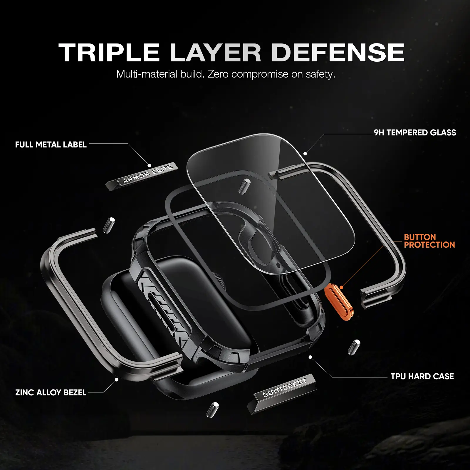 Ever worried about cracking your Apple Watch screen or denting its sleek frame? ArmorElite Case has your back with tough, military-grade protection designed for Apple Watch Series 11, 10, 9, 8, 7, 6, 5, 4, and SE models. Featuring a heavy-duty zinc alloy metal bezel, this case not only looks sharp but guards your watch against daily bumps, drops, and scratches. The included 9H tempered glass screen protector keeps your touchscreen crystal clear and super responsive, so swiping stays smooth. Plus, the TPU hard case offers shock absorption without adding bulk, fitting snugly around your watch. All buttons, the crown, and side features remain fully accessible, so you never miss a beat. Installation is a breeze with the snap-on design—no tools needed. Just click it on to armor up, or snap it off to show off your watch’s original look. Please note, the Apple Watch itself is not included. Ready to protect your investment with style? Grab the ArmorElite Case and keep your Apple Watch looking fresh and fearless every day!