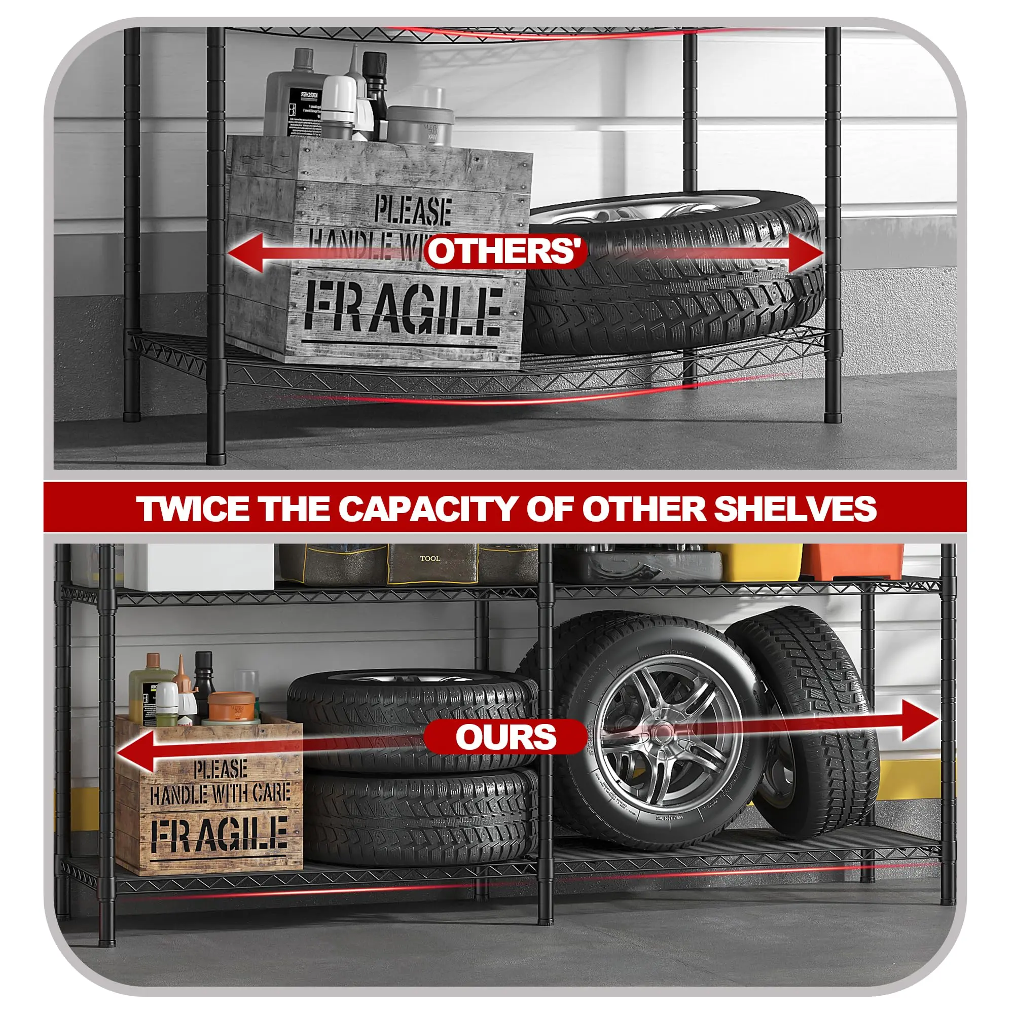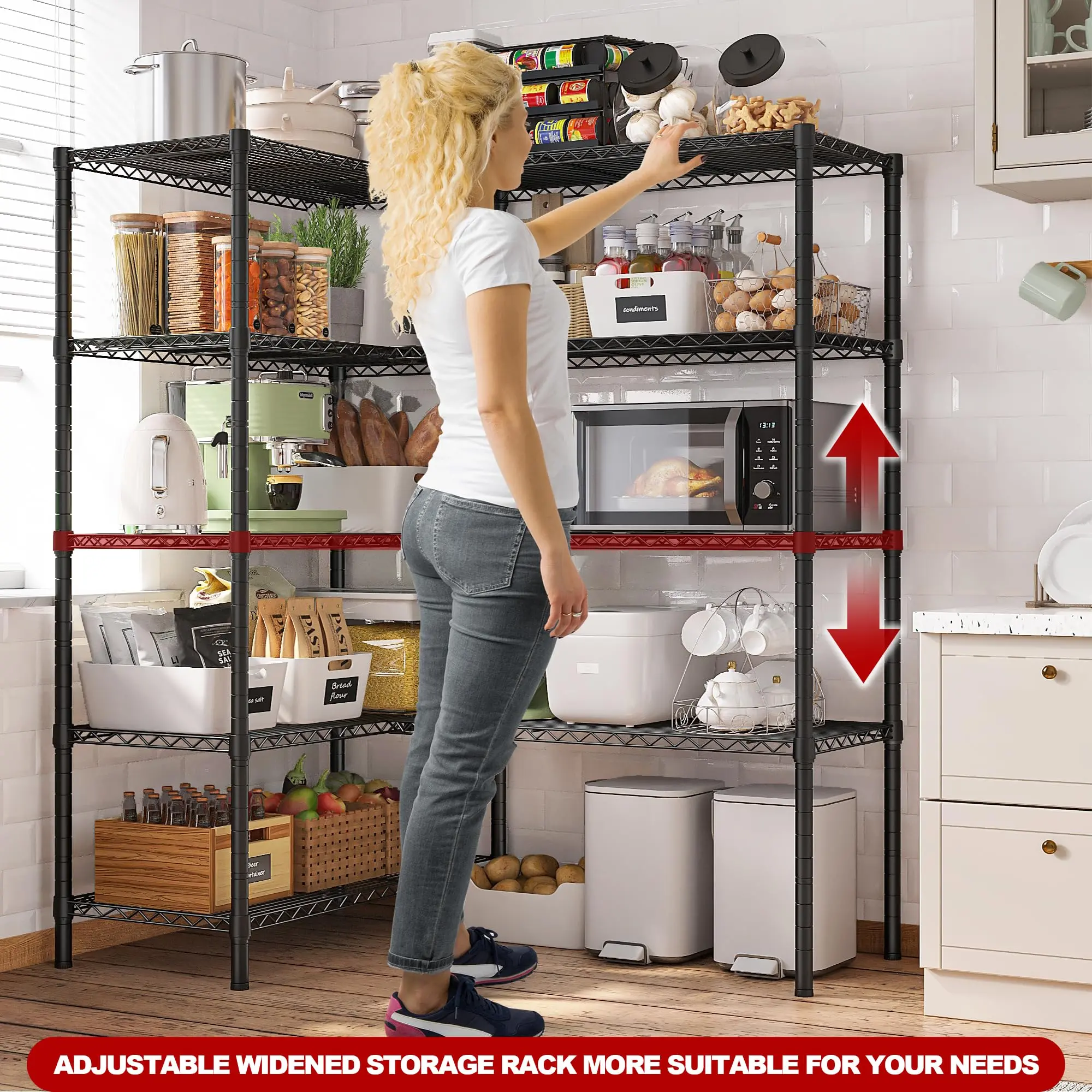 ·【1400 LBS Capacity Super Sturdy Wire Shelving Rack】This Metal shelves for storage made of heavy duty steel wire,and has undergone special coating treatment.Every solid thickened shelving with extra stiffener,can easily bear 280LBS a total of 1400 lbs bearing capacity.