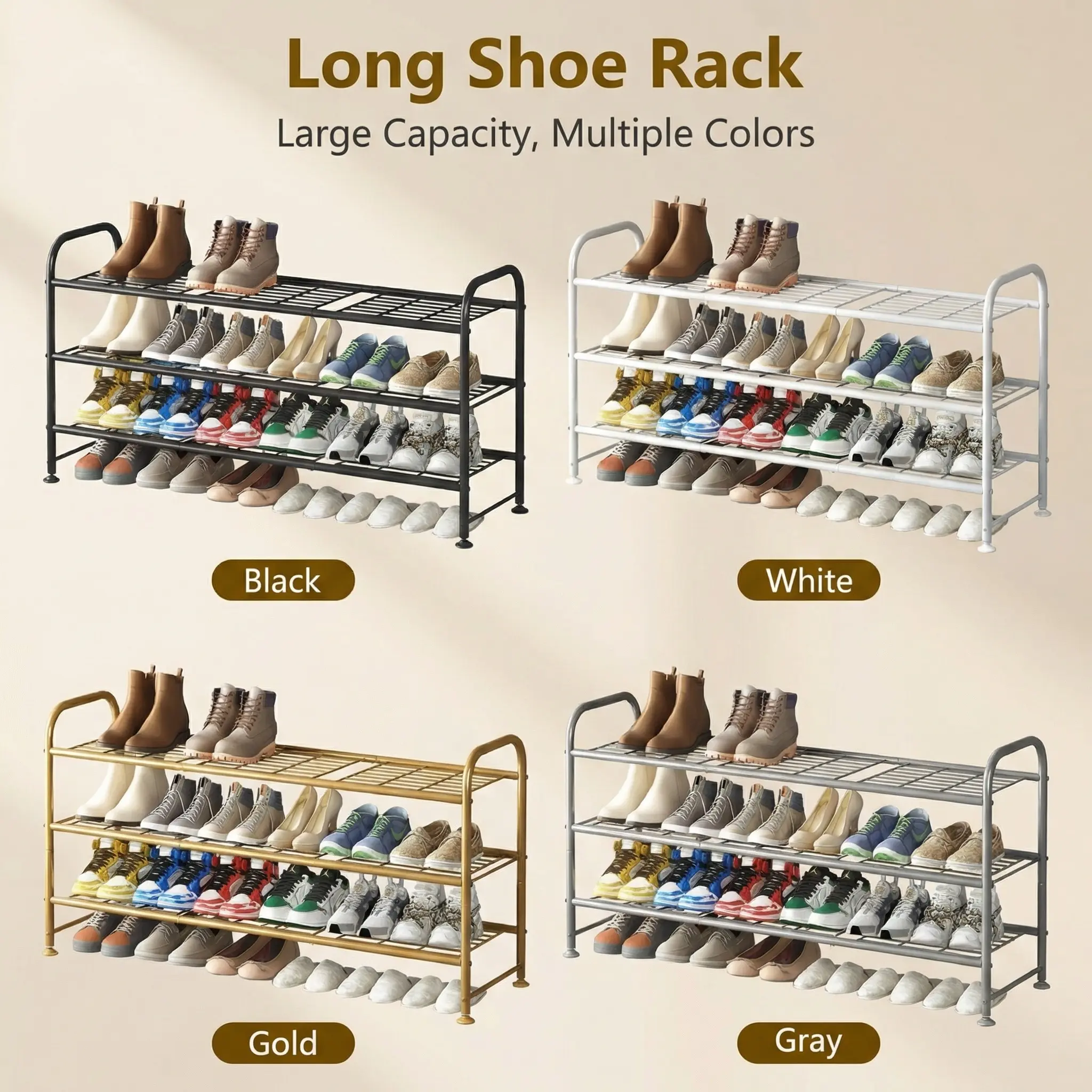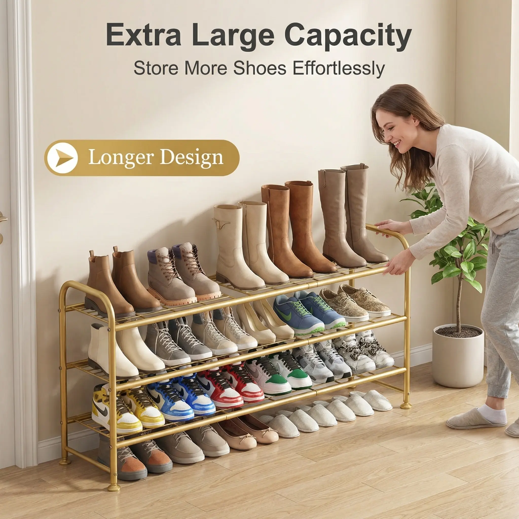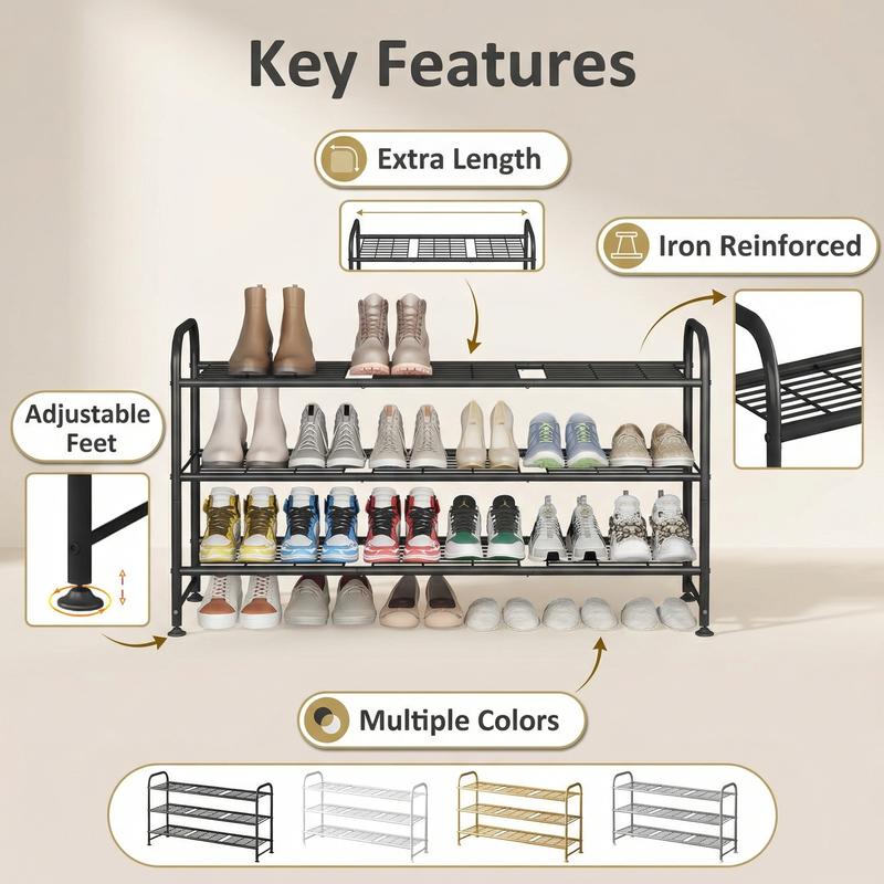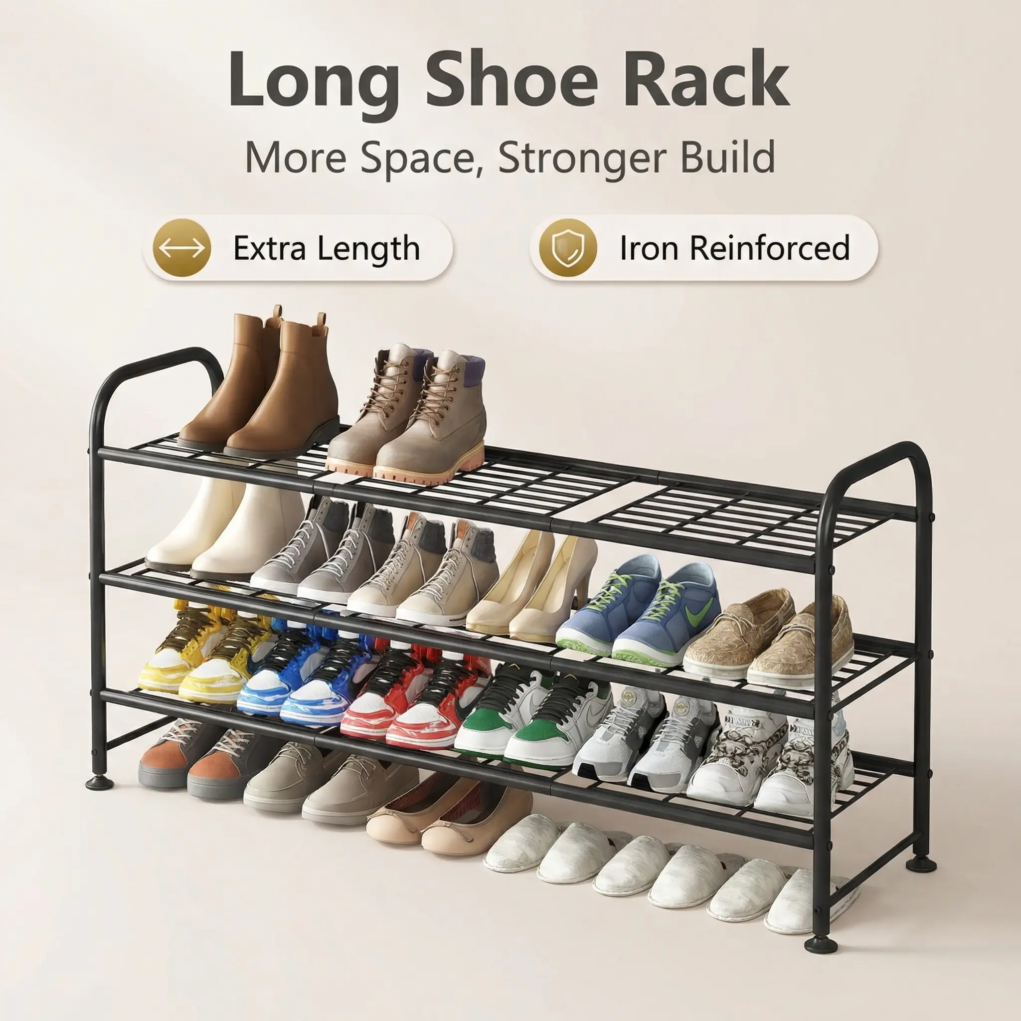 This 3-tier long shoe rack can store up to 20-24 pairs of shoes, including women's, men's, and children's footwear. It accommodates various types like slippers, sandals, high heels, sneakers, and boots. The raised bottom provides extra space for more shoes, making it perfect for closets. Keep your entryway organized with this versatile storage solution.