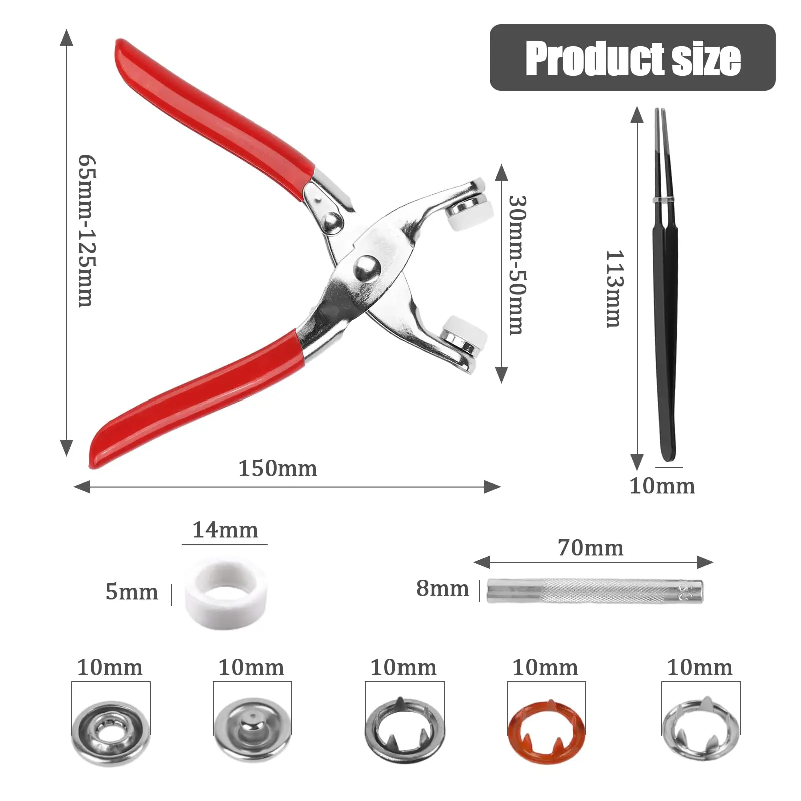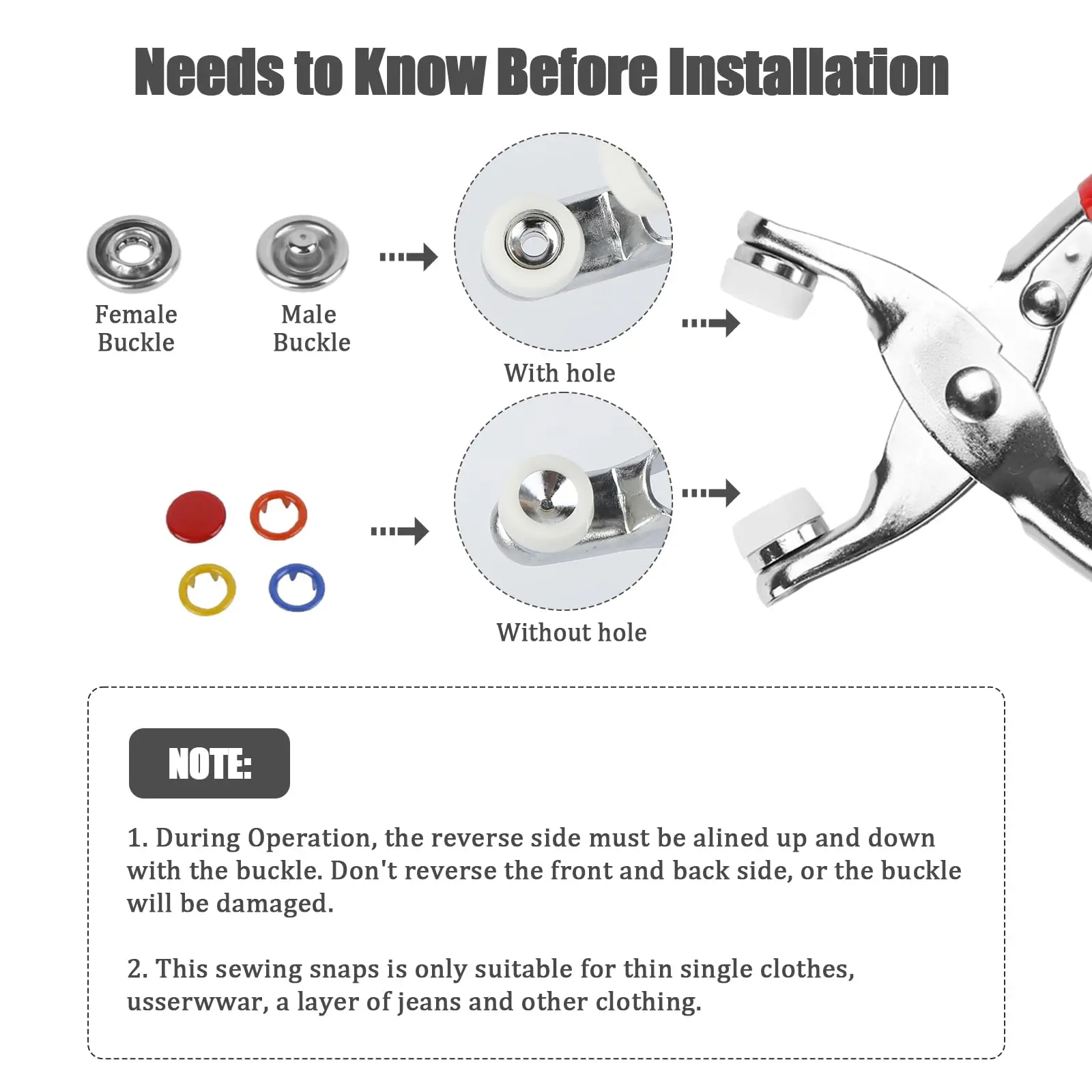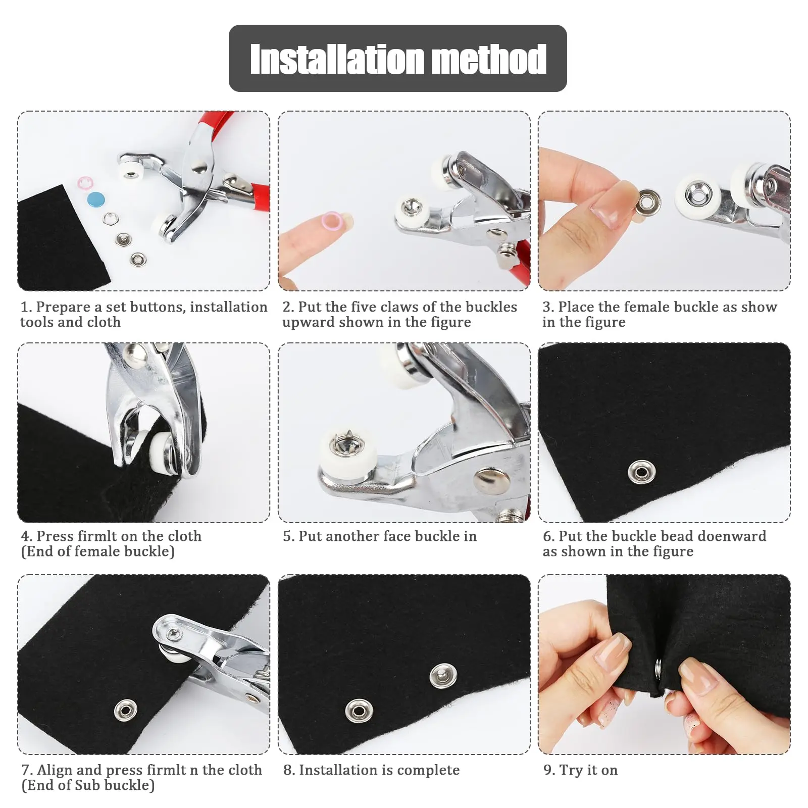 ·Widely used: push button set with pliers are ideal for shirts, backpacks, hats, overalls, quilt covers, curtains, raincoats, animal clothing or other places you need to be applied to meet your DIY design requirements.