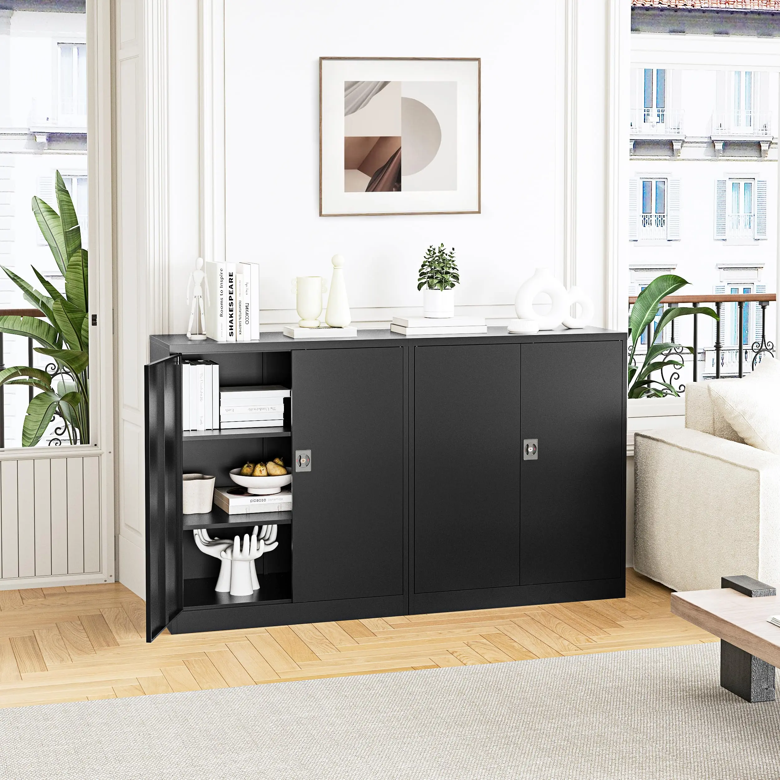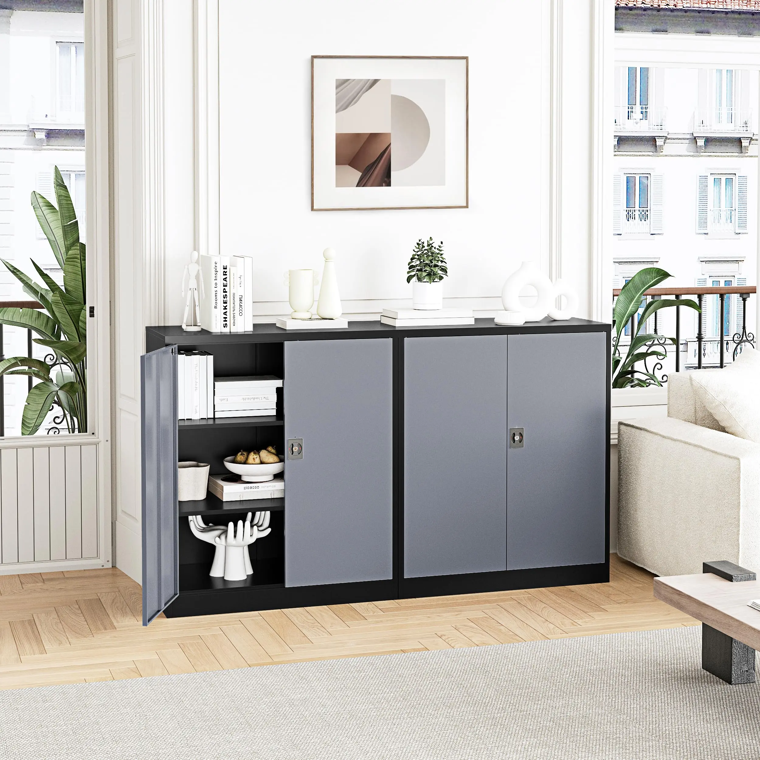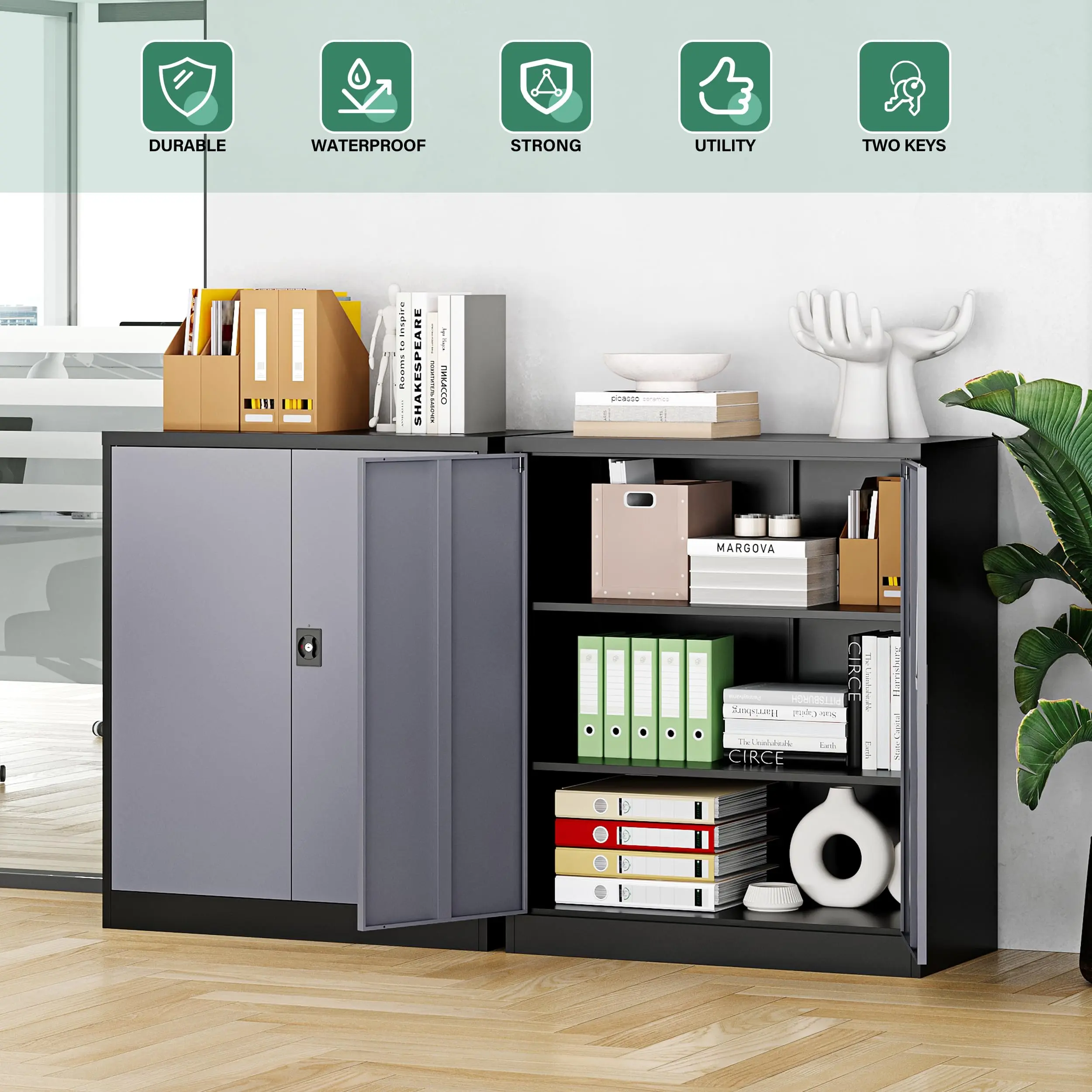 『Large Storage Space』:Steel storage cabinets H36 * W32 * D16 inch ,features 2 adjustable shelves,the shelves cabinet can hold up to 180lbs,36-inch counter height perfect for use in homes,offices,garages,schools,shops,warehouses or other commercial spaces.