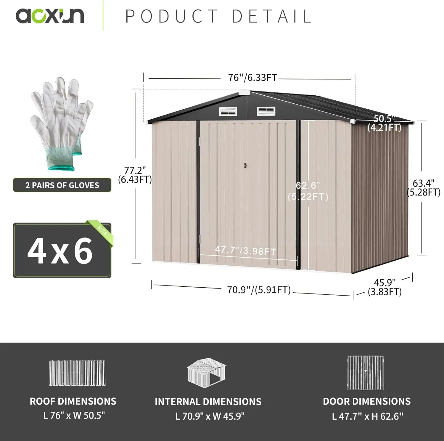 ·Spacious Outdoor shed: Are you still struggling with not having enough or no outdoor storage space? Take a look at this 5.9'x3.8' metal storage shed, which measures 46 “L x 71 ‘W x 77 ’H. Whether it's for bike storage, garden tool storage, temporary storage room, it's great for your outdoor storage needs.
