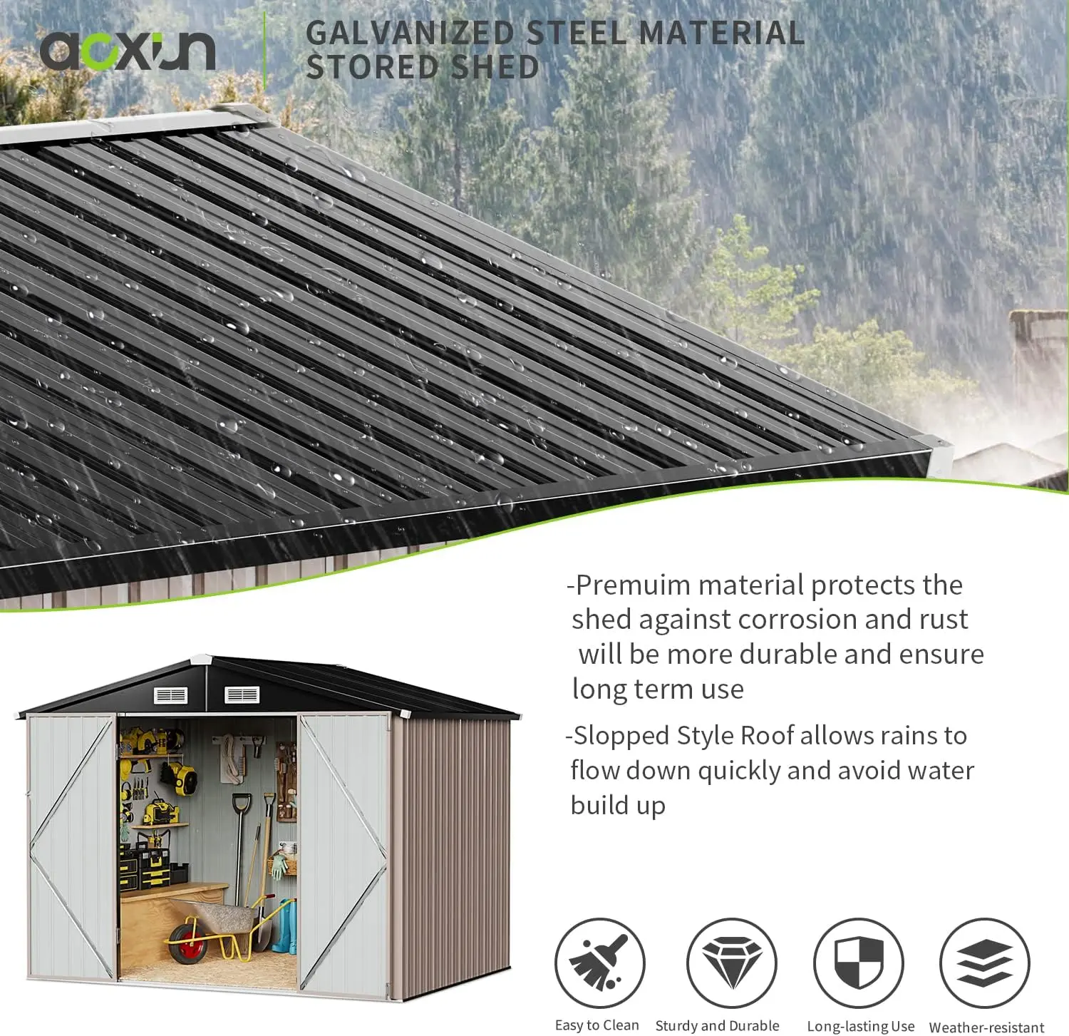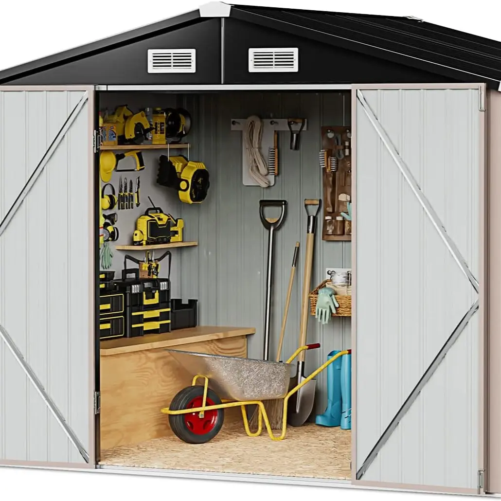 ·Sloped Roof & Vent: The sloping roof design prevents rainwater and fallen leaves from accumulating on the roof, reducing the trouble of cleaning up fallen leaves and water. Dual vents are designed to speed up air circulation inside the outdoor shed and freshen the air