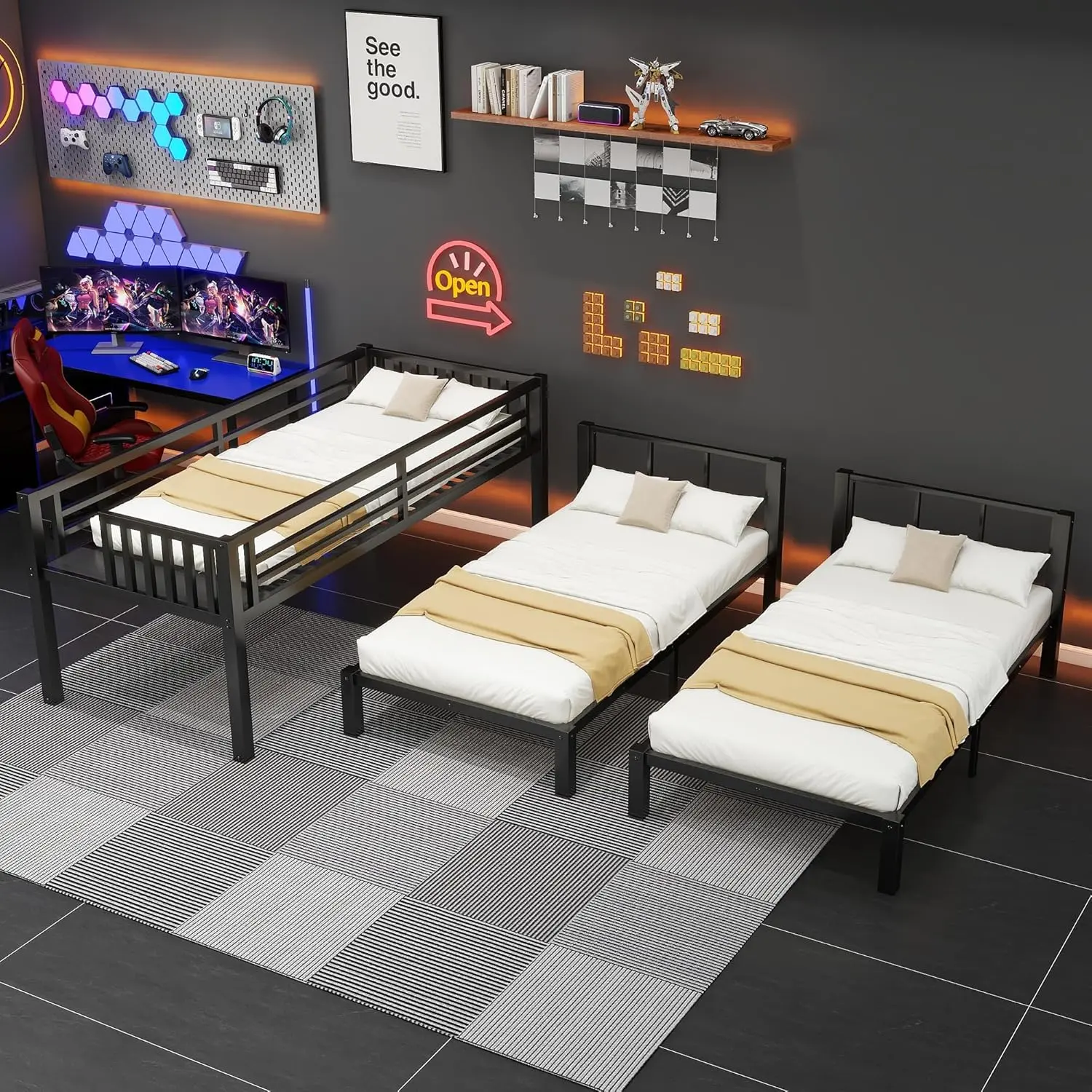 This metal twin over twin & twin bunk bed is an excellent space saver because it can be used for 3 children.It is the perfect solution for extended family, guests, or hosting your child's friends for a sleepover.A shelf on the upper bed can use for storing clothes and other accessories.You can also turn the upper bed into a twin XL bed with this shelf.There is a small table in the middle of the two beds on the lower level, which can be used to place commonly used items or books.I believe that this metal twin over twin & twin bunk bed will bring you a different experience.