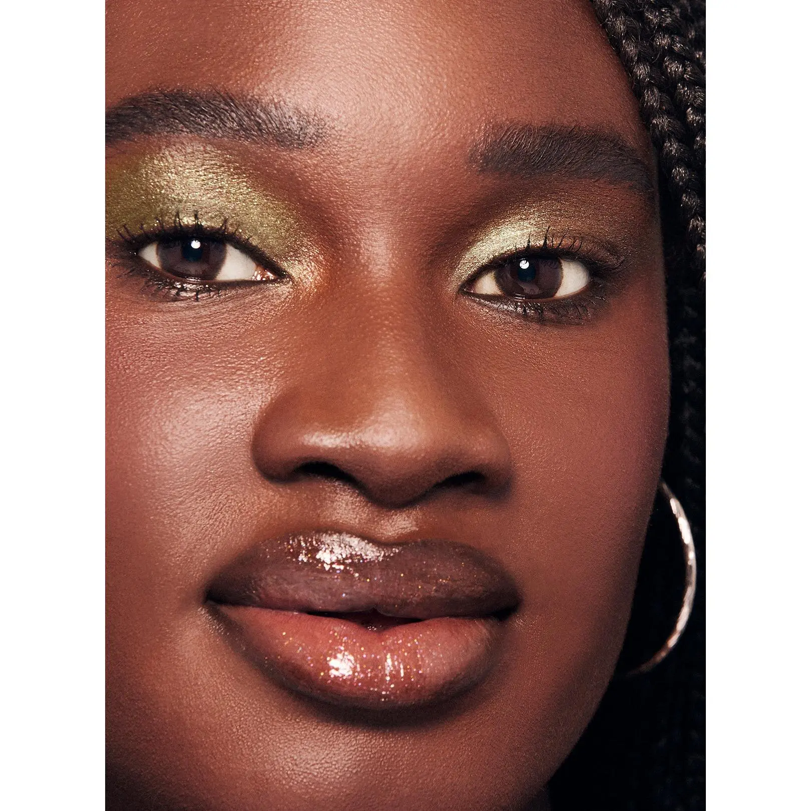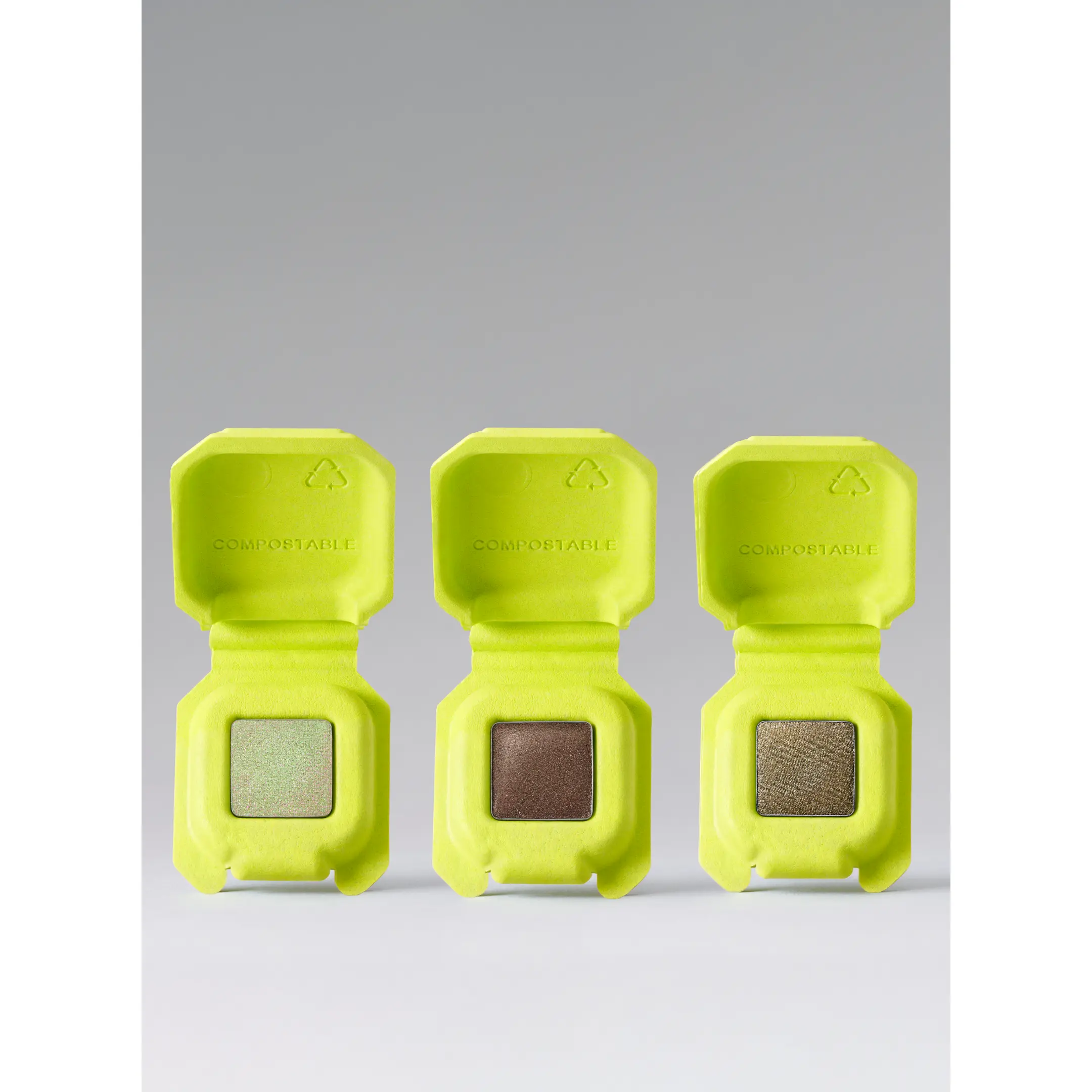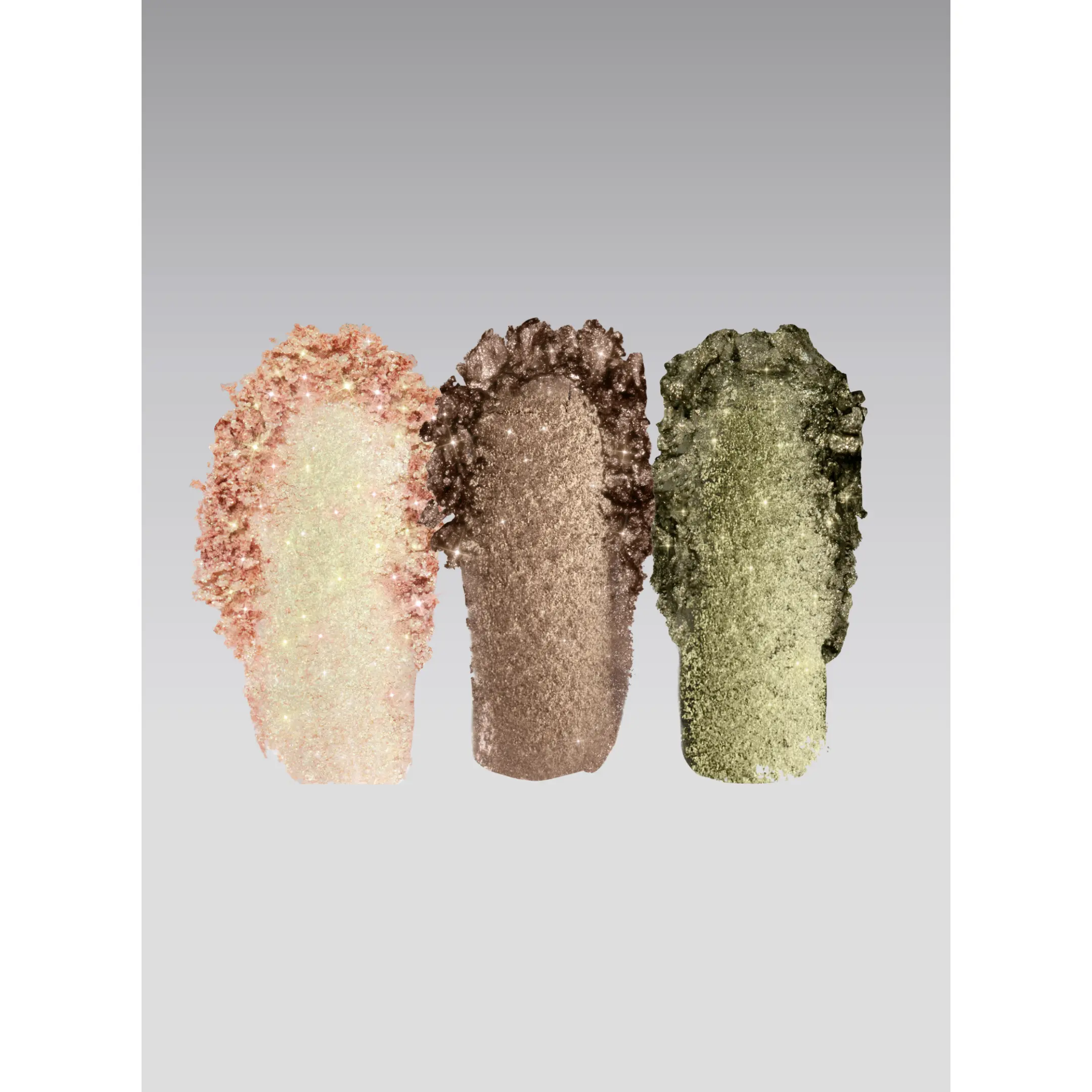 Our glossy metallic eyeshadows are buttery, foiled, one-swipe color magic. We’ve paired best seller WET PEBBLE, a deep taupe, LIL DERANGED, a striking moss green, with ELVIN THINGS, a crystal shimmer with mint and peach reflects.