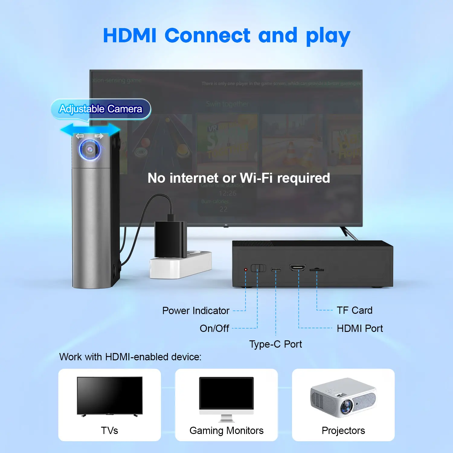 Simply connect it to your TV, gaming monitor, or projector via an HDMI cable, and you're ready to play (No internet or Wi-Fi required). Its compact design fits elegantly on your TV stand or mantel, and it's even portable enough to slip into a backpack for on the go. Perfect for players of all ages, bring home this ultimate game console that combines fun, exercise, and family interaction to kickstart your joyful moments.