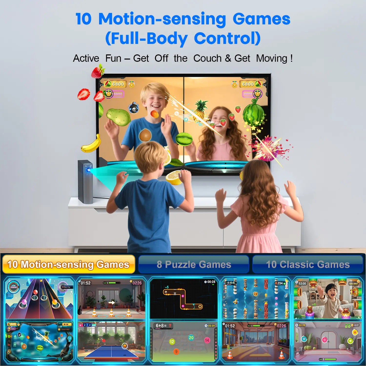 More awesome game packs are in the works and will be available for Free Download on the official website. Transform your living room into an indoor playground.MetFut gaming system comes with 28 preloaded thrilling games, carefully selected based on big data research for maximum popularity and fun, including Joy Cut Fruits, Swin Together, Undersea Treasure Hunt, Rhythm Balls, etc. Perfect for family game nights, parties, or indoor exercise—there’s something for everyone.