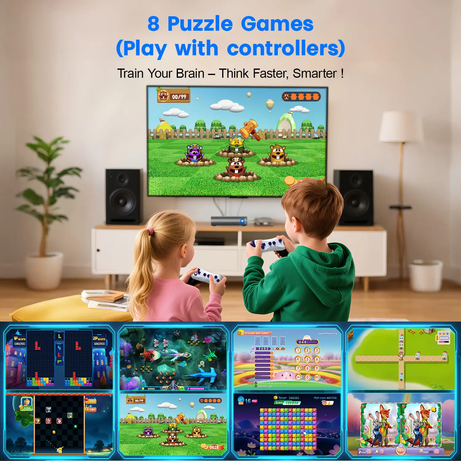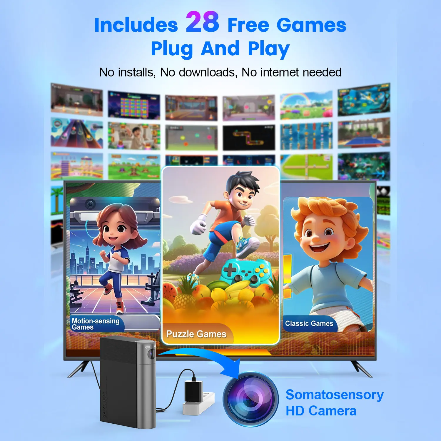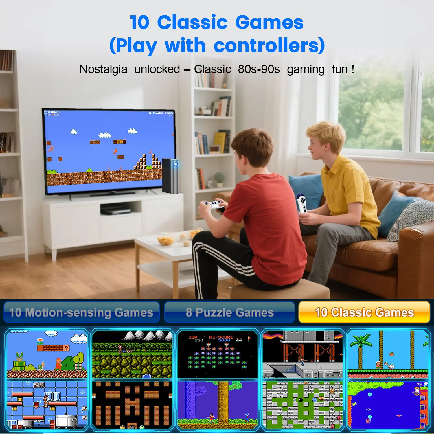 Play motion-sensing games with no controllers needed—just use your body to play. Our built-in adjustable camera accurately tracks your movements while gently blurring facial details (native 1080P HDMI output) for privacy-conscious and game focus. For puzzle & classic games, use the included 2 wireless controllers (batteries not included - requires 4 AAA batteries). Easily switch between active play and casual games.