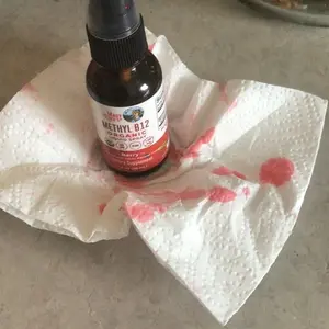 IMPORTANT: B12 is a natural dye and as such the natural red pigment of the methylcobalamin may stain! Make sure to use caution when taking this product so as to preserve your clothes and surroundings!