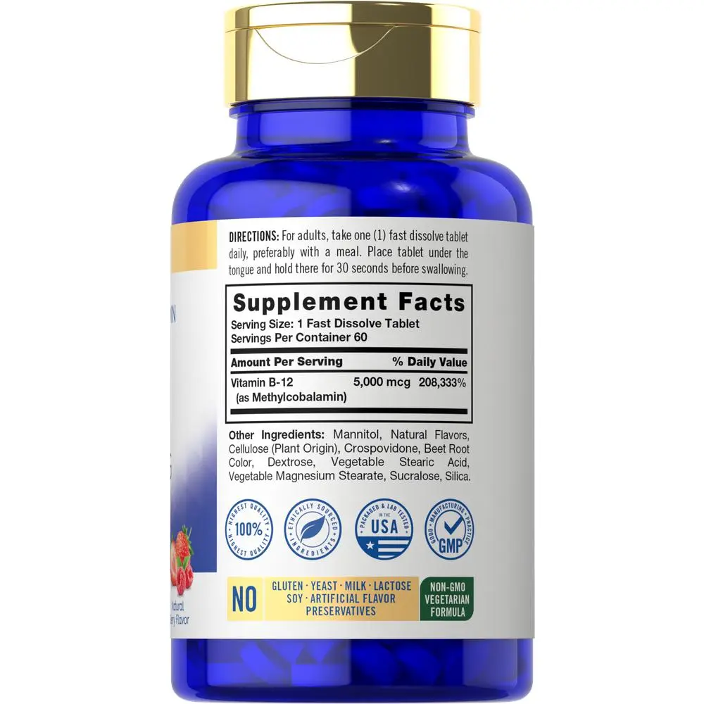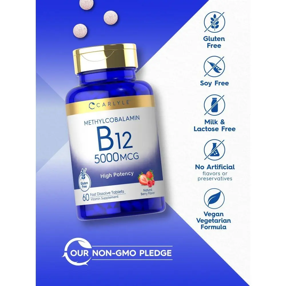 Support your routine with Carlyle's highly innovative formula which delivers 5,000 mcg of Vitamin B12 as Methlycobalamin. Fast dissolve tablets provide this essential vitamin in a delicious natural berry flavor you'll love. Our vegetarian formula is gluten free and non-GMO, made with no artificial flavor or preservatives, making it a perfect choice for adult men and women everywhere!