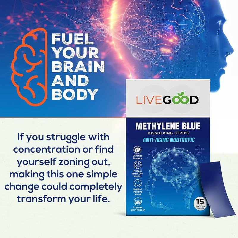 LiveGood Methylene Blue Nootropic Strips are designed to help support cognitive performance and overall wellness. Each fast-dissolving oral strip delivers 20 mg of high-purity 5 % methylene blue, formulated for clean, quick absorption and reliable results.