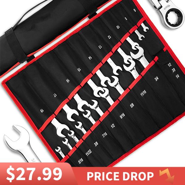 Package Included : 10 Metric Ratchet Wrenches: 6mm, 8mm, 10mm, 12mm, 13mm, 14mm, 15mm, 16mm, 17mm, 19mm; 10 SAE Ratchet Wrenches: 1/4″, 5/16″, 11/32″, 3/8″, 7/16″, 1/2″, 9/16″, 5/8″, 11/16″, 3/4″; 1 Roll-up Storage Pouch