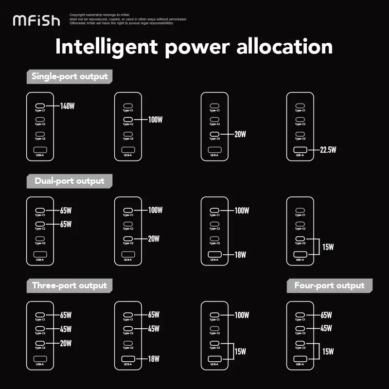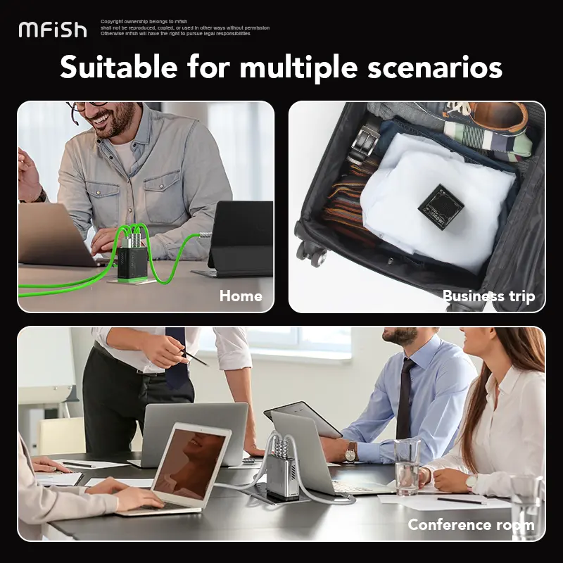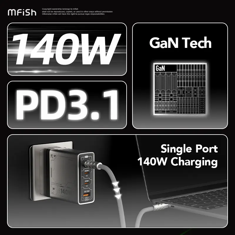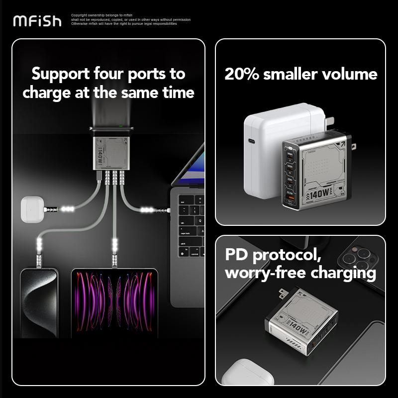 Ever been stuck with a dead phone and only one charger port? The MFish 140W GaN Charging Station is here to rescue your devices with its four-port flash charging power. Whether you’re juggling a smartphone, tablet, or laptop, this charger fuels them all fast and efficiently. Its foldable, original design means it’s travel-ready—just fold it up and stash it in your bag without any fuss. Plus, the universal plug ensures you can charge a variety of brands without swapping chargers. The grey and green charger sets come with matching cables, so you’re ready to go right out of the box. Best of all, it’s safe and eco-conscious, meeting CA Prop 65 standards with no harmful chemicals lurking inside. Whether you’re at home, at work, or on the road, this charger keeps your tech powered up and ready. Grab the MFish 140W GaN charger and say goodbye to low battery anxiety!