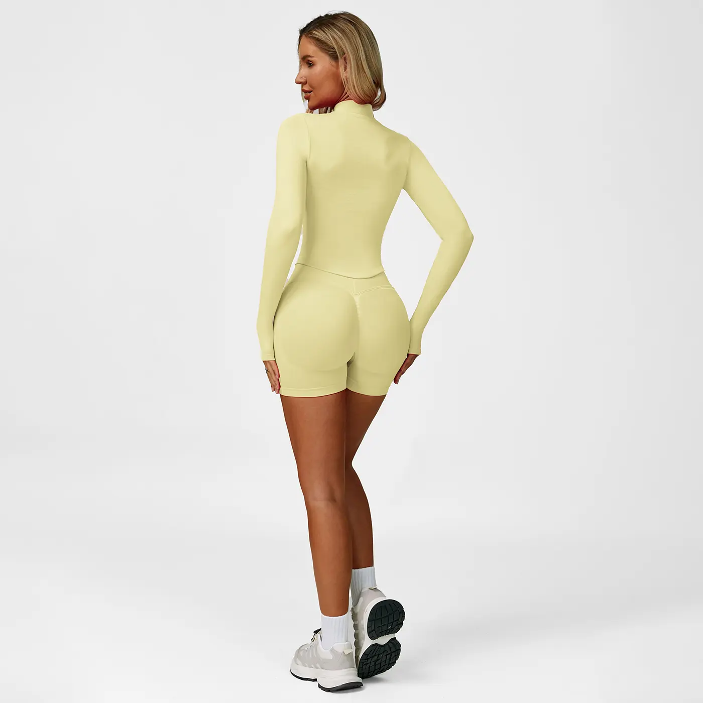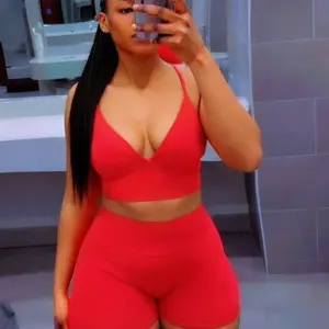 So cute, really stretchy! The sports bra is a bit tight and the padding is a little bulky but doesn’t appear bad! The shorts are so comfy, a little sheer but not bad. Love the jacket that it comes with. True to size just a bit snug, size up for extra comfort!