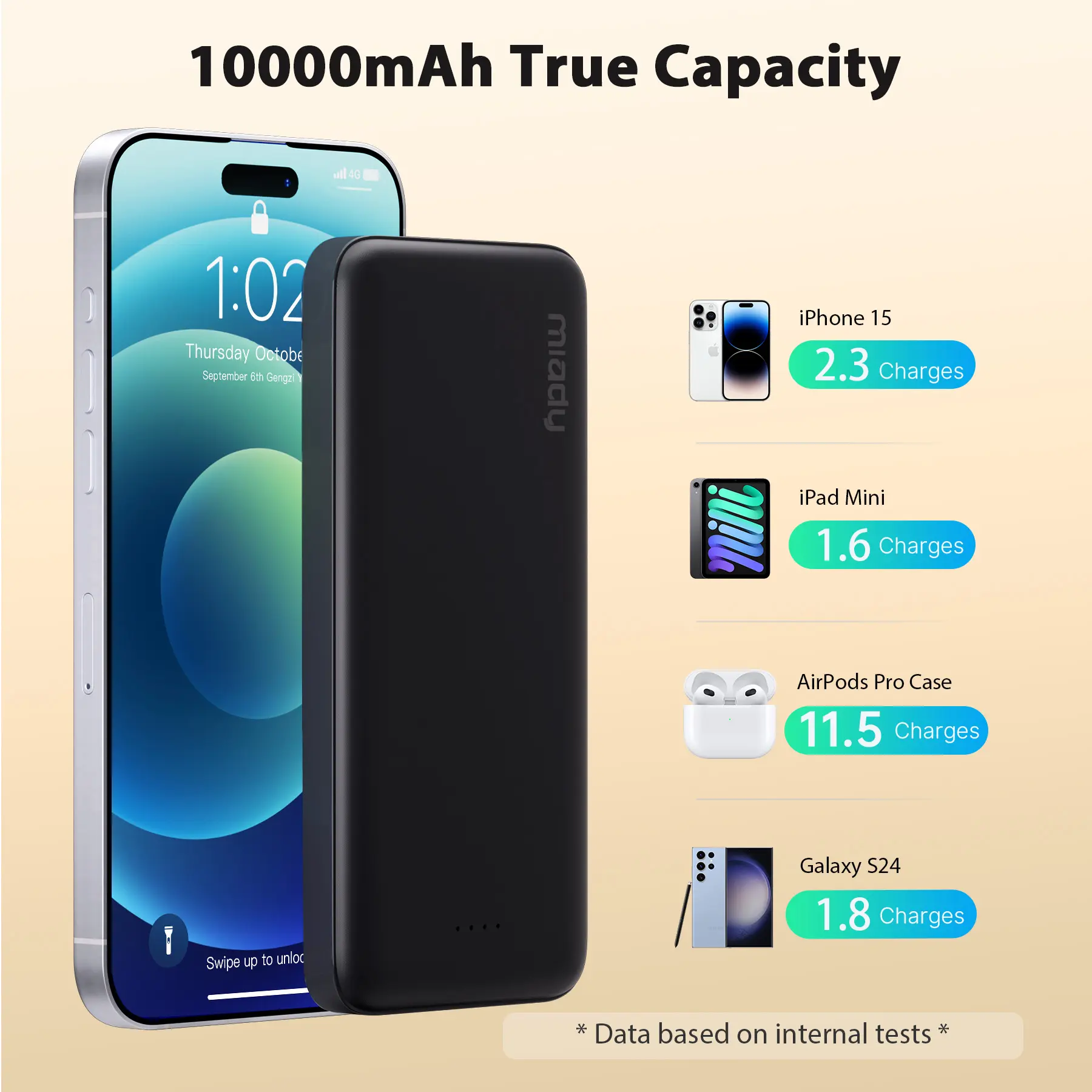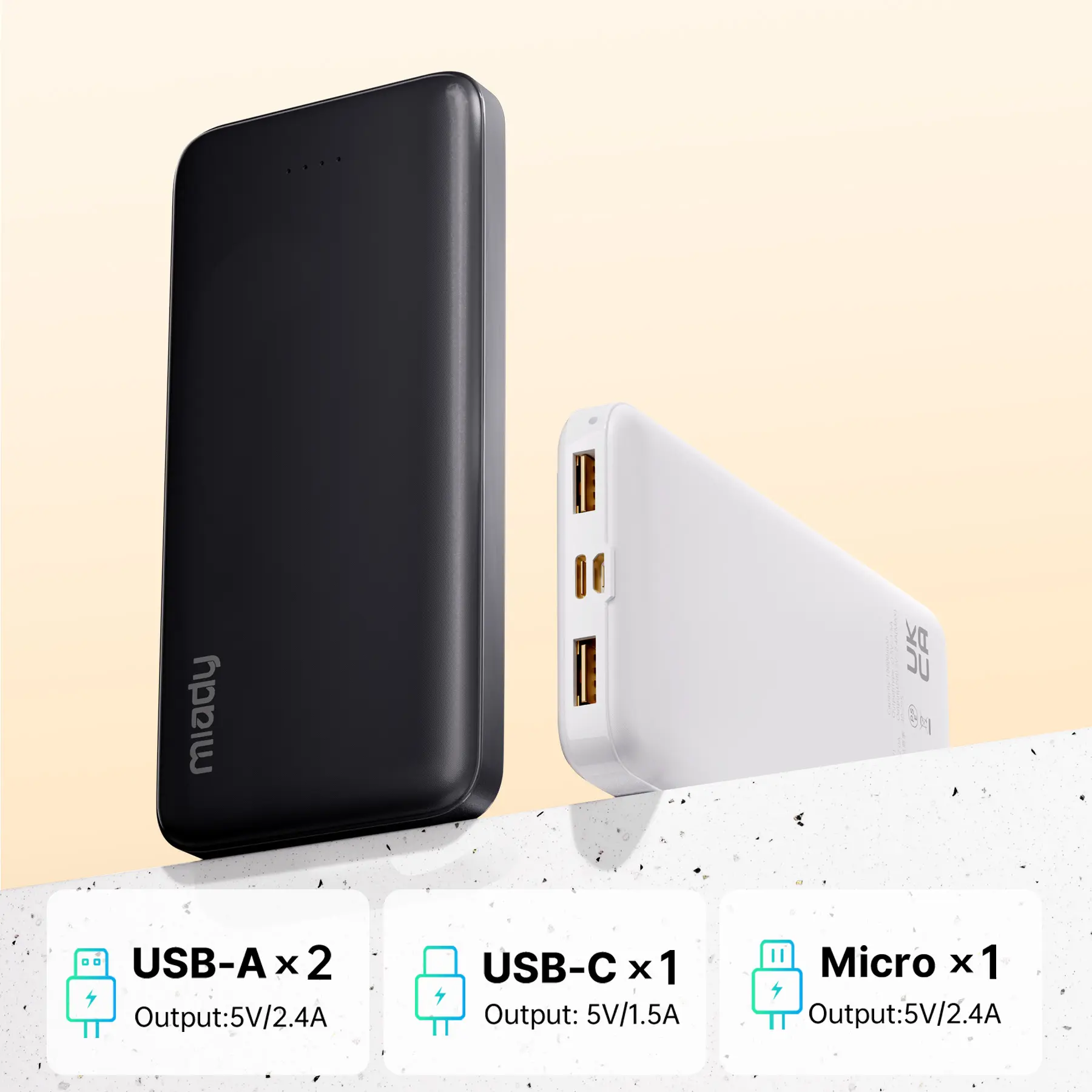 Ever run out of juice right when you need your phone most? The Miady 2-Pack 10000mAh portable chargers have your back with enough power to keep your devices going all day. These slim, lightweight power banks fit comfortably in your hand or bag, making them perfect for commuting, travel, or just everyday use. Each charger features dual USB-A ports and a speedy USB-C output, so you can charge two devices at once, whether it’s your iPhone 15, Galaxy S23, or Pixel phone. Thanks to the upgraded USB-C output, fast charging is easier than ever—just plug in your USB-C cable (included) and power up quickly. The safe Li-polymer battery is lighter and more reliable than typical lithium-ion packs, so you can even take these on airplanes worry-free. Each charger can refill itself in about 5 hours and will charge your iPhone 15 up to 2.3 times or Galaxy S24 nearly twice. In the box, you get two Miady power banks, two USB-C cables, and a user manual to get started. Ready to stay powered wherever life takes you? Grab this handy 2-pack and never fret about a dead battery again!