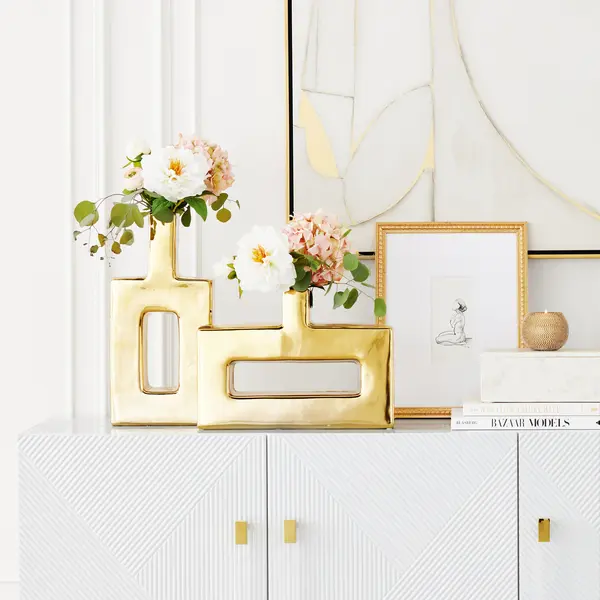 Crafted of ceramic with a stylish gold glaze, the vases are available in two sizes to create a pleasing composition when paired. Also available in Silver and White.