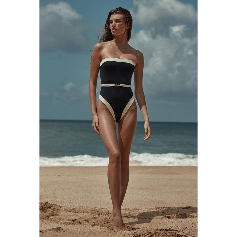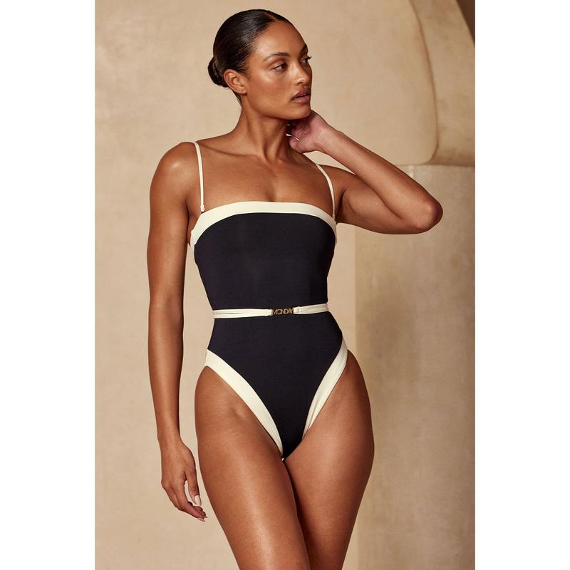 Dive into sophistication with our Miami One Piece. Featuring removable straps and a gold Monday logo removable belt for versatile flair, the strapless silhouette and cheeky coverage exude confidence, making it the perfect choice for a chic look on and off the sand. Features: Color block detailing Bandeau one piece w/ silicone gripper tape and shelf bra Adjustable & removable shoulder straps Gold "Monday" hardware Detachable belt Cheeky coverage