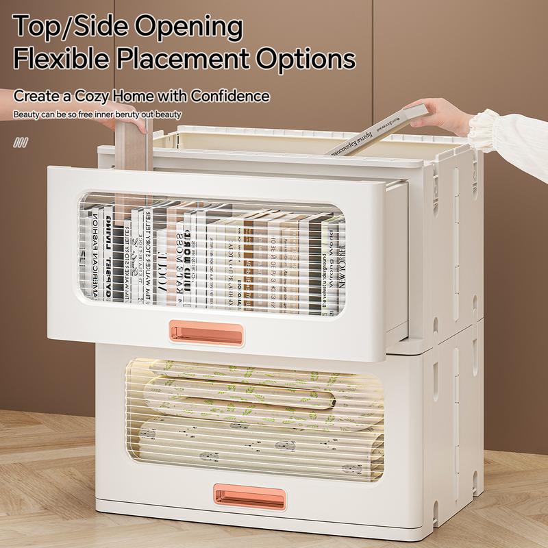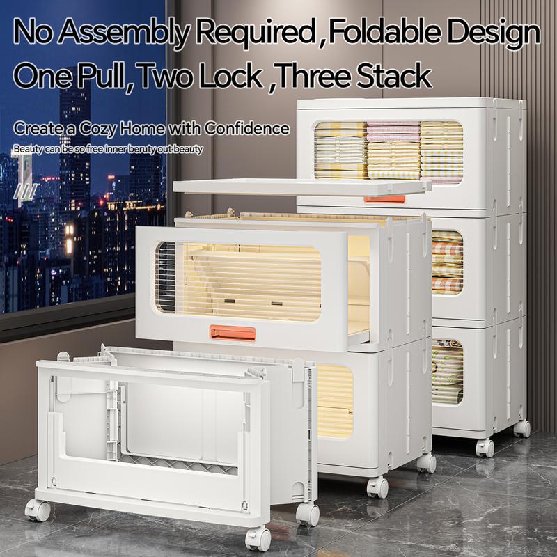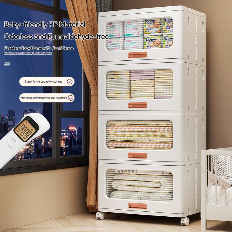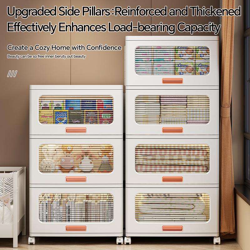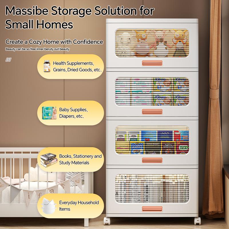 MiAoLi  4Tier Stackable Plastic Storage Cabinet System - Large-Capacity Storage Boxes with Doors and Casters, Space-Saving Folding Home Organization Solution for Bedrooms, Living Rooms, and Kitchens, Easy Assembly