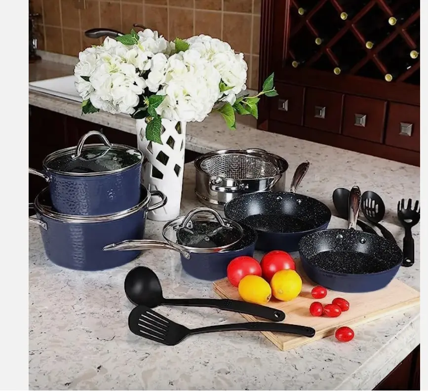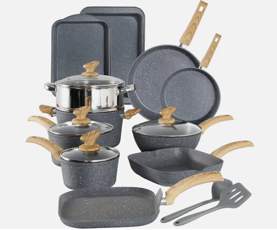 This set features a granite-coated pot, ensuring even heat distribution. Perfect for induction cookware, it enhances cooking efficiency. The granite coating provides a smooth surface for even cooking results. Ideal for those seeking reliable cookware for everyday use.