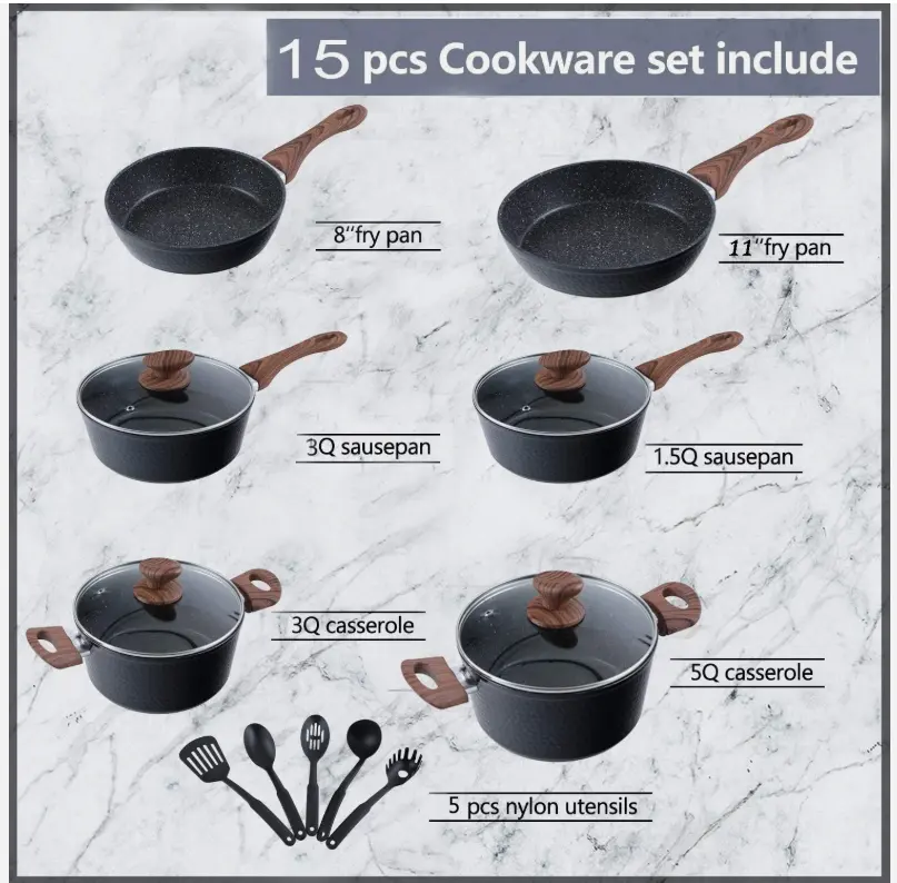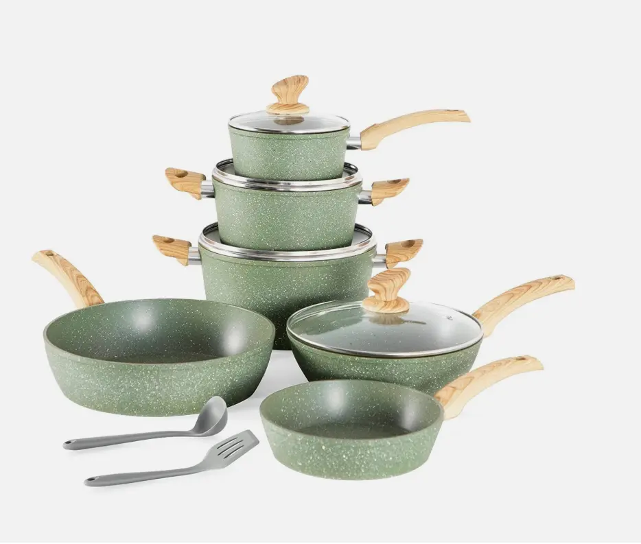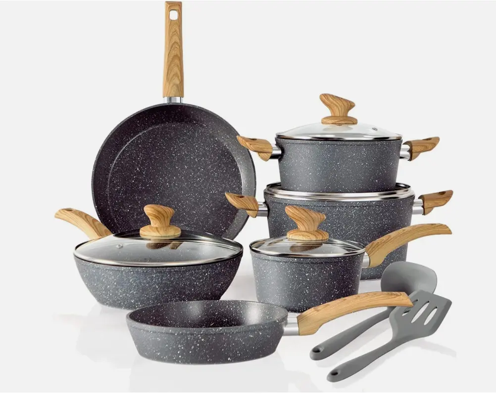 The pots and pans come with wooden handles, providing a natural and comfortable grip. These handles are designed for ease of use, making them ideal for everyday cooking tasks. The wooden material adds a touch of warmth to your cooking experience.