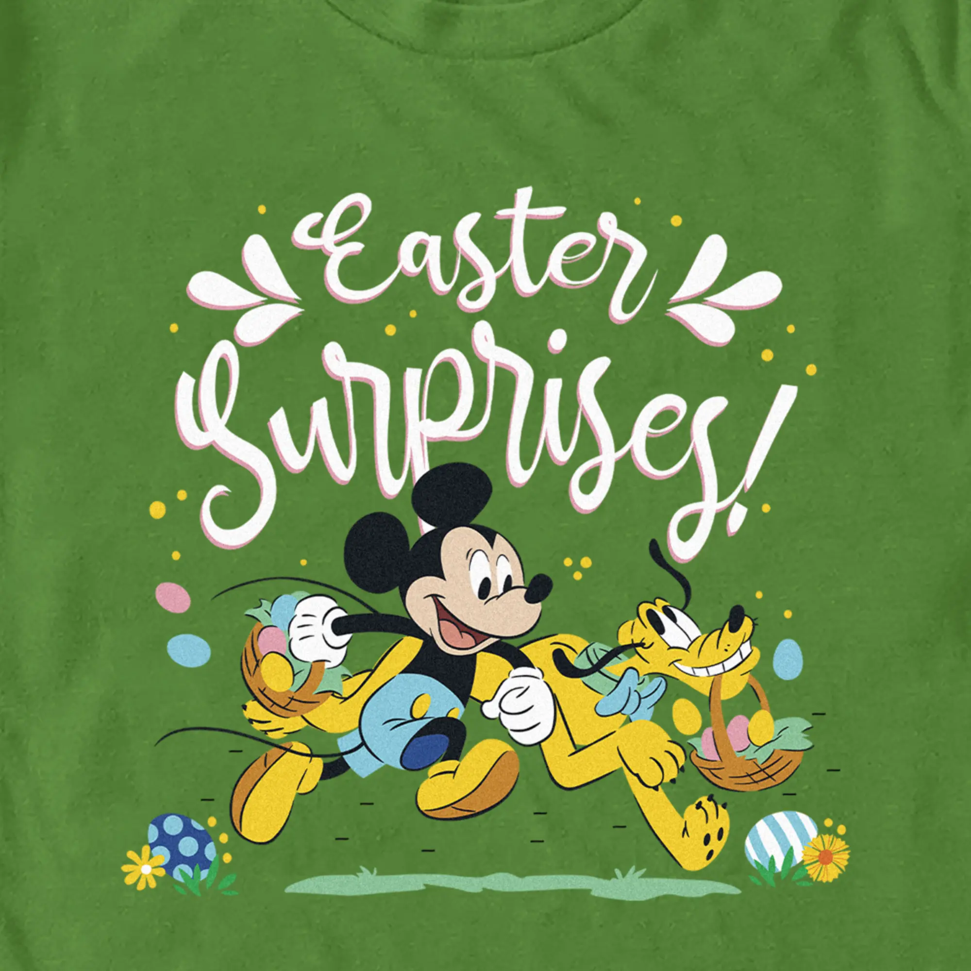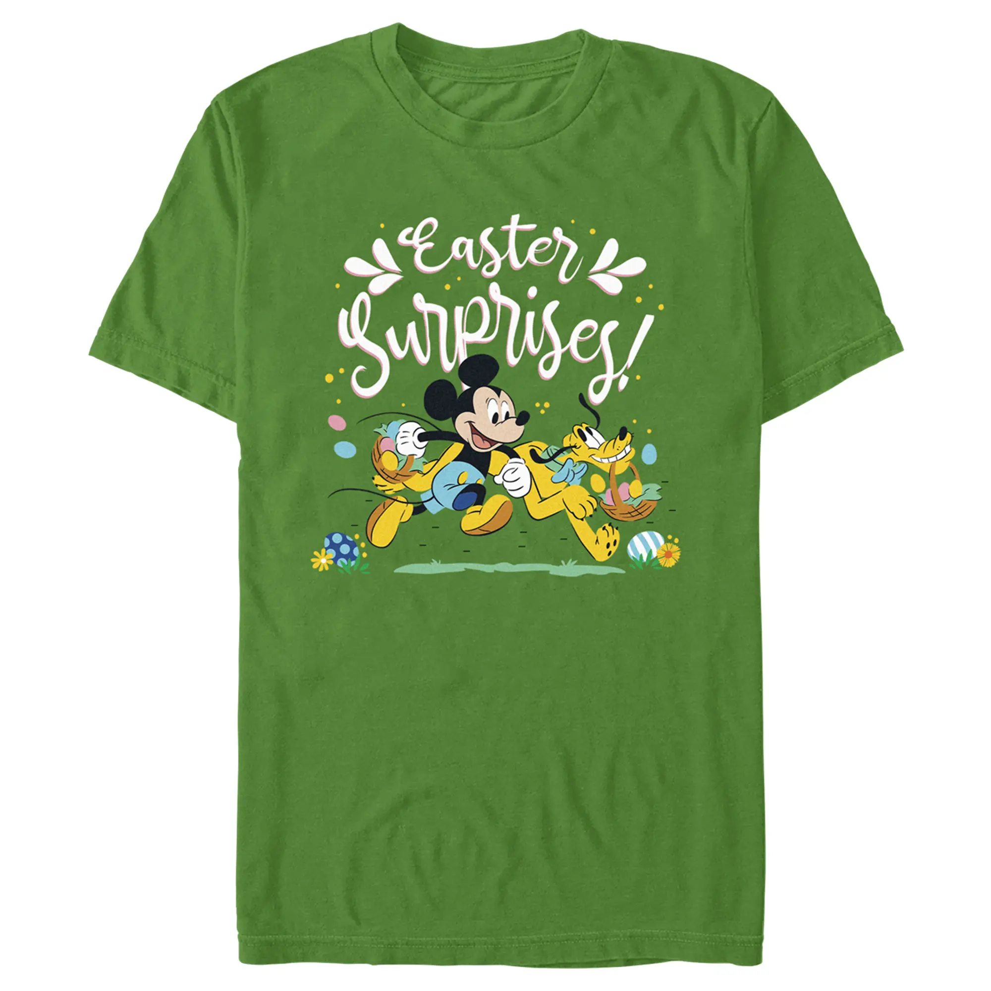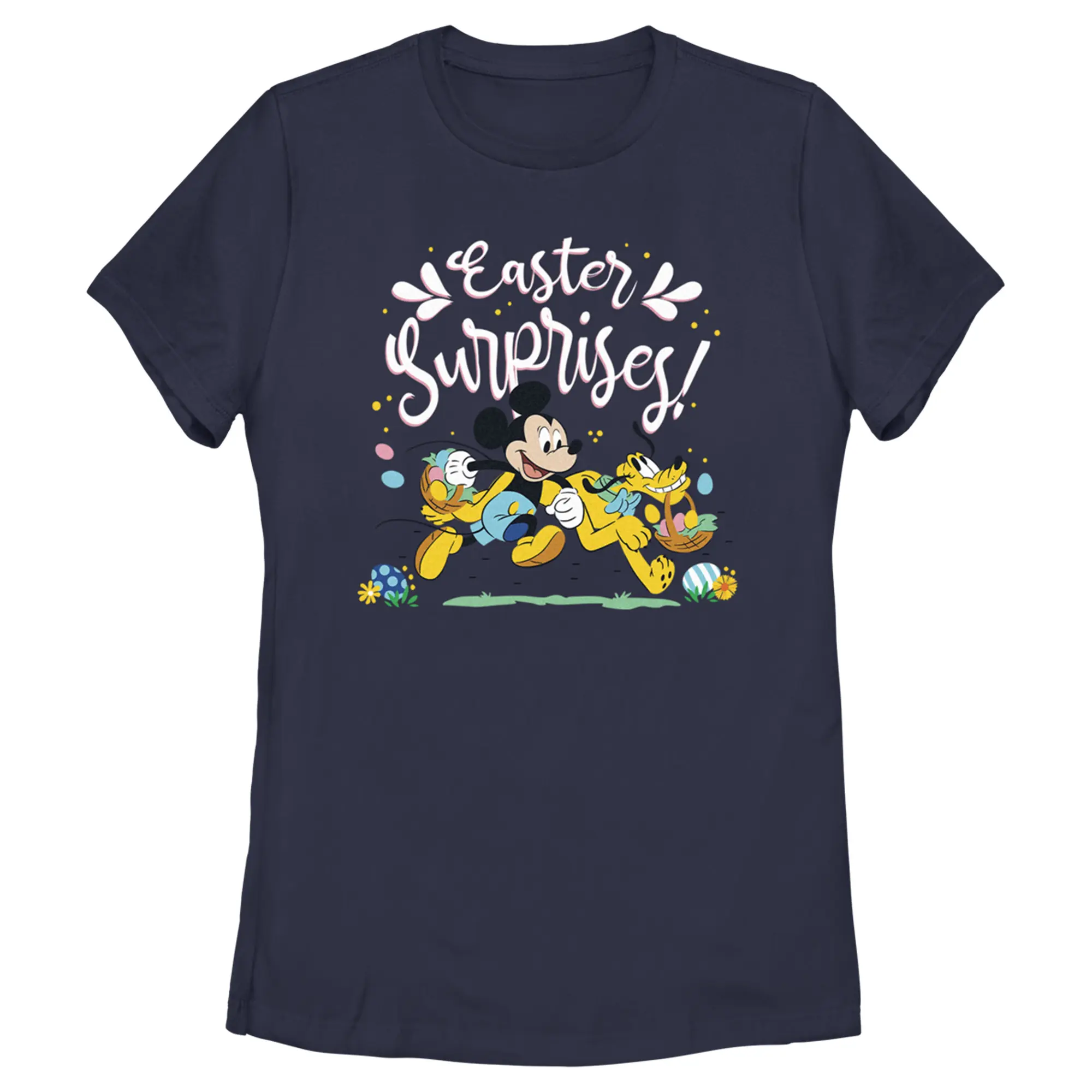 Grab a basket and go on a hunt for this Easter women's t-shirt! Featuring Mickey Mouse and Pluto holding baskets along with text that says "Easter Surprises!"